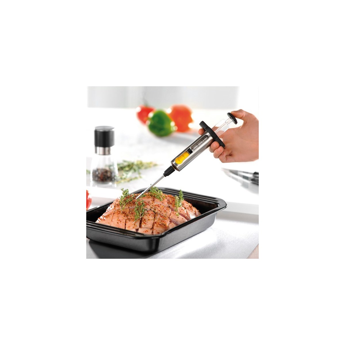 Une seringue à marinade est utile pour mariner votre viande à griller ou à rôtir au four et la mariner ou l'assaisonner de l'intérieur, plus particulièrement les gros morceaux de viande. Aspirer tout simplement le liquide souhaité, introduire l'aiguille dans la viande et appuyer sur le piston. Ne pas remplir avec un liquide chaud, la seringue devient très chaude. Risque de blessure !