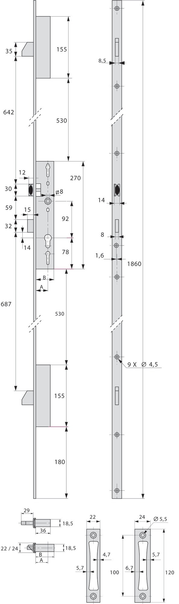 | Libellé | Serrure 3 points TF3 pêne dormant/demi-tour 36mm têtière en U 24x6mm - STREMLER - 6370.36.0A |