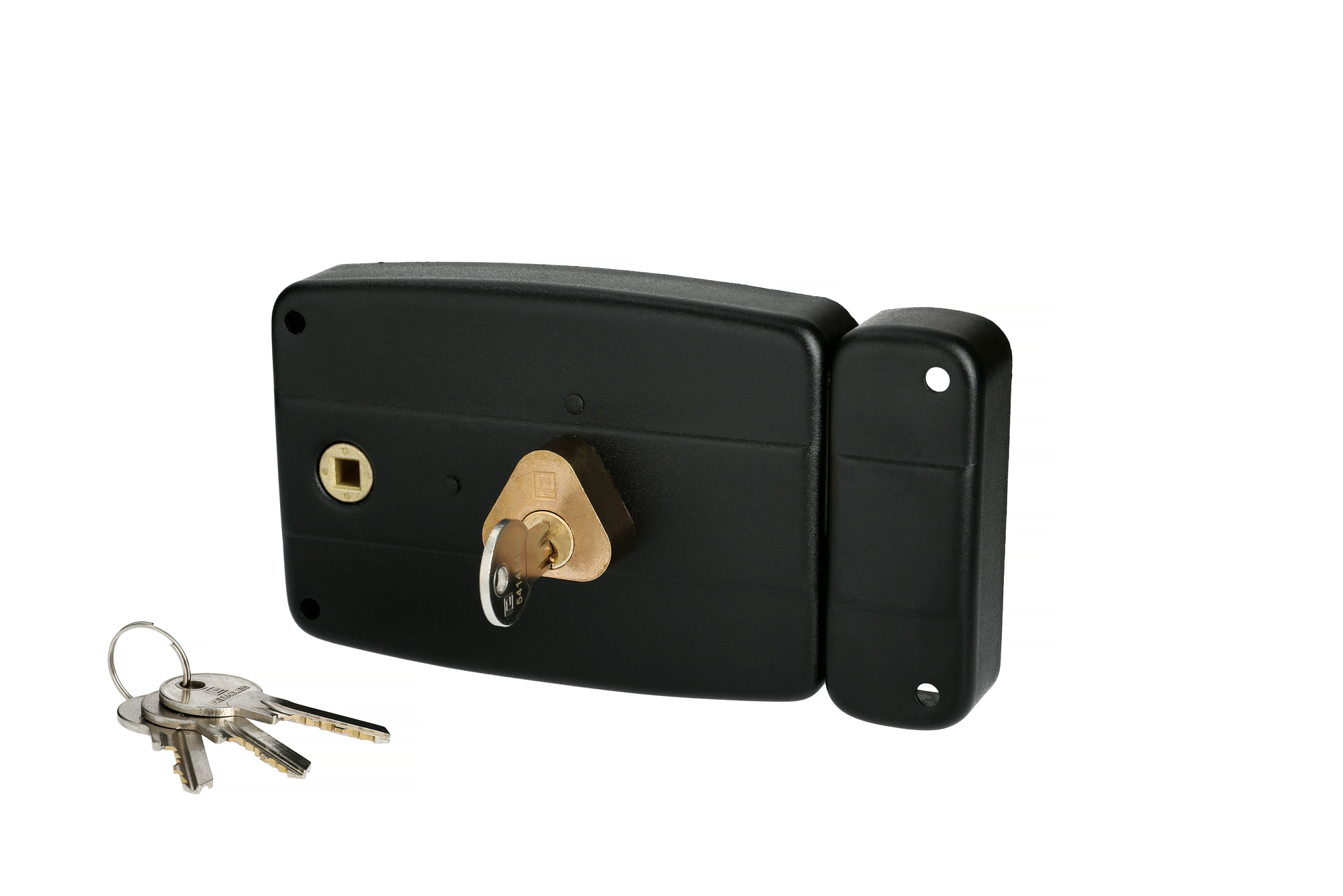 Plus produit Serrure monopoint en applique 5 goupilles, fouillot carré 6 mm, cylindre 45 mm (compatible 40 mm), finition peinture damask noire, 4 clés fournies, boîte de frappe séparée, ne convient pas pour l'extérieur