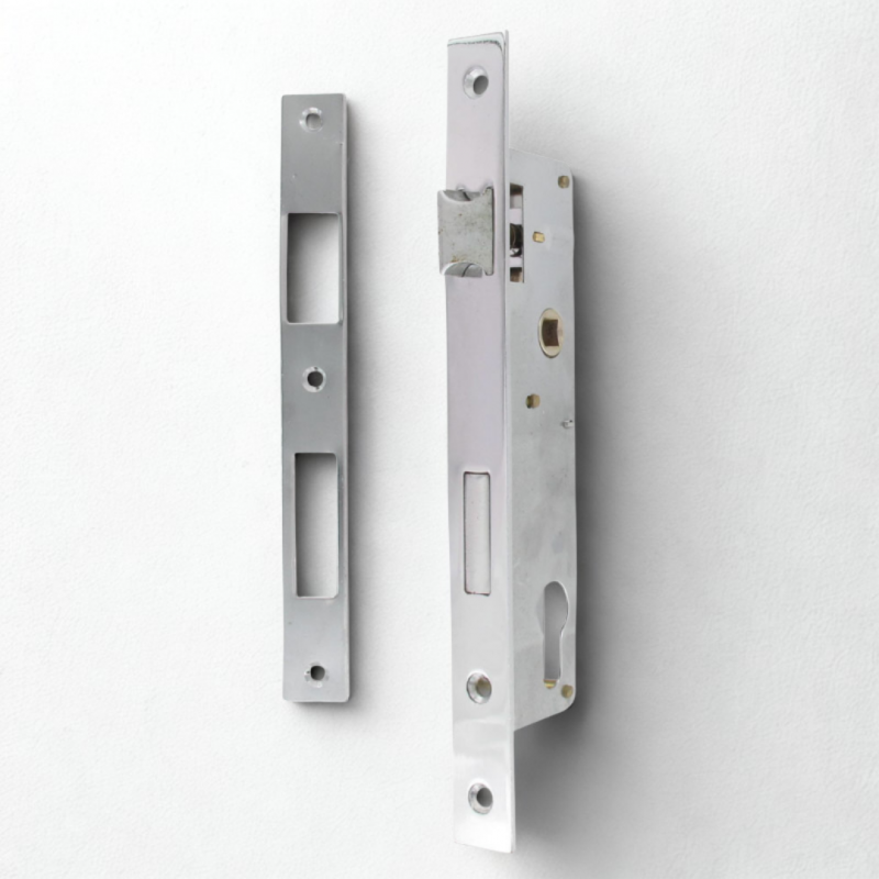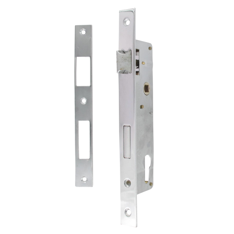 Libellé Serrure portail battant - Axe à 30mm - Entraxe 85mm - Chromée + gâche