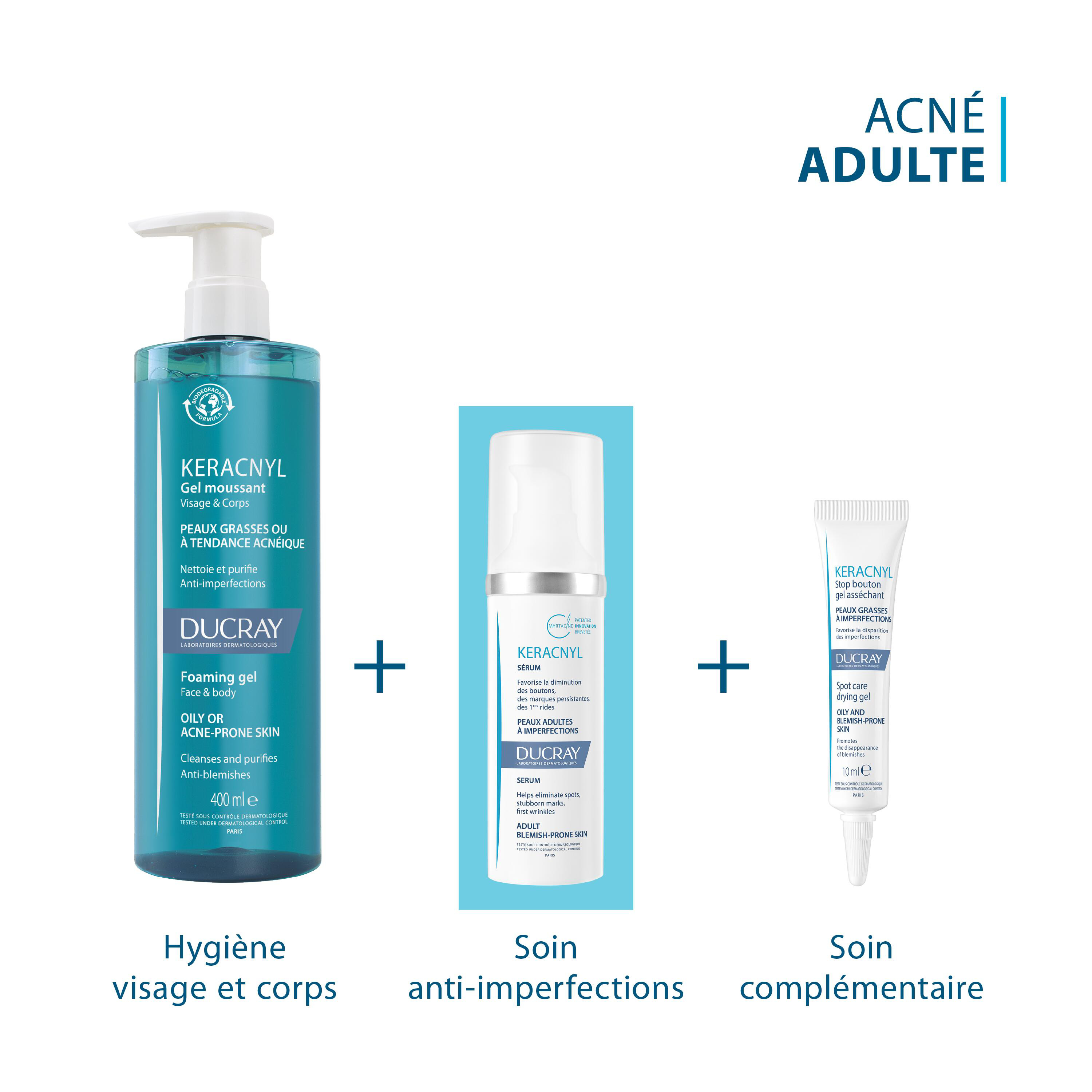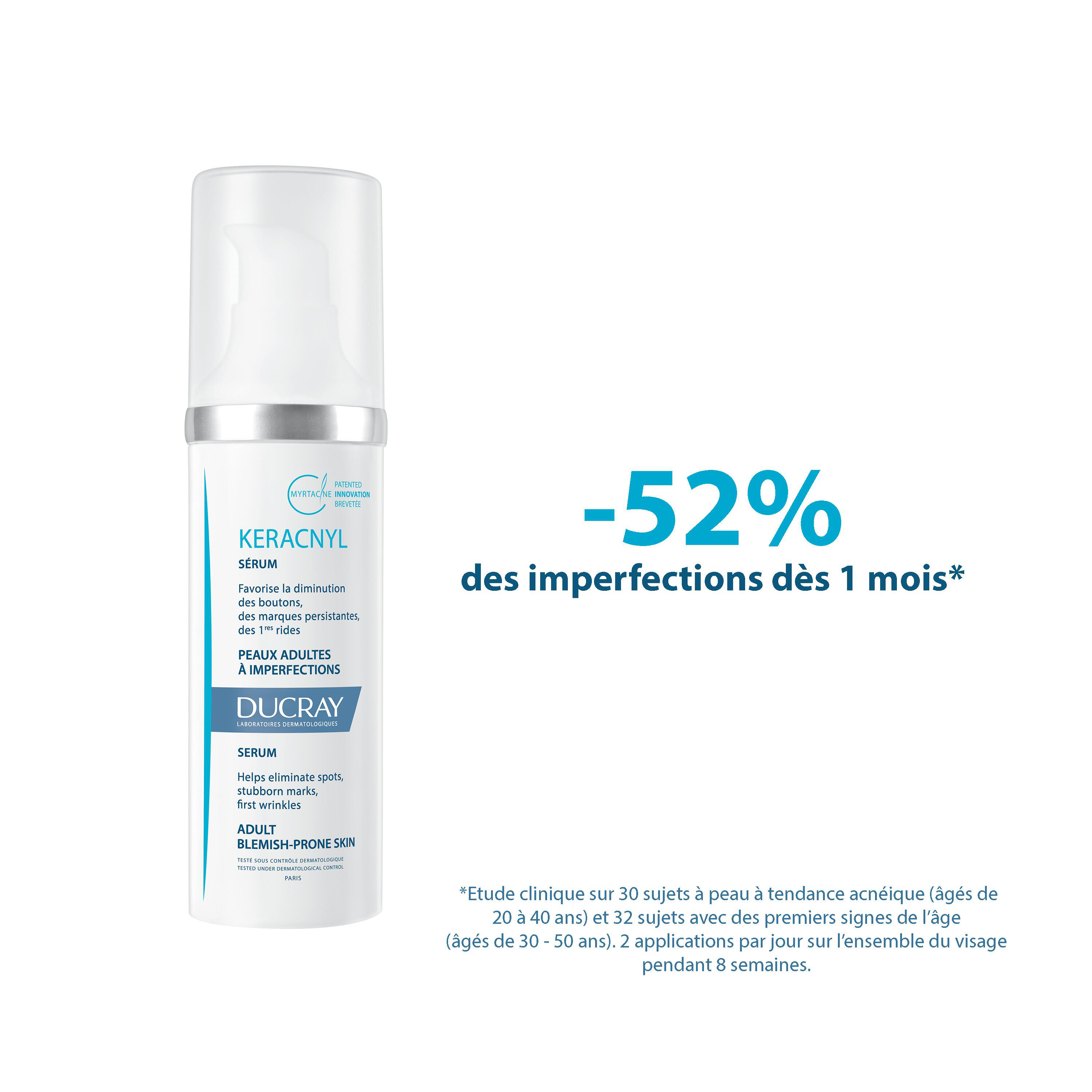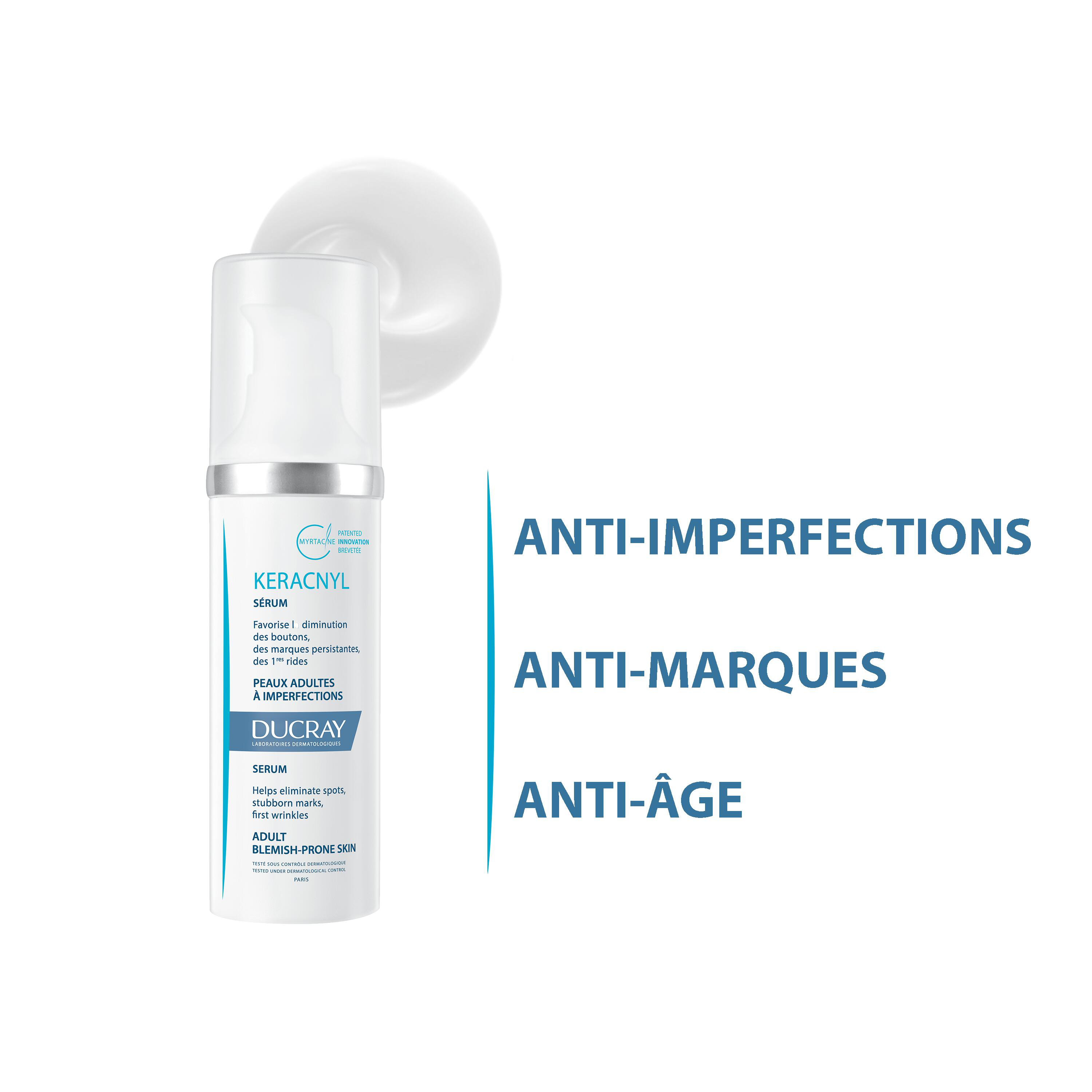 • Le sérum KERACNYL est un soin quotidien anti-imperfections et anti-âge à destination des peaux à tendance acnéique de la femme adulte • Sa formule triple action favorise la disparition des boutons et des marques pigmentaires tout en limitant l’apparition des premières rides • Au fil de l’utilisation, la peau paraît plus lisse, plus nette et les imperfections s’atténuent • Excellente base de maquillage pour les peaux adultes sujettes aux imperfections • DIMINUE l'inflammation, aide à la disparition des imperfections et atténue les cicatrices liées à l'acné et les marques pigmentaires • CONTRIBUE à l'équilibre de la flore bactérienne C.acnes • AGIT contre l'apparition des premières rides et lisse la peau Un soin qui purifie la peau en profondeur, désincruste les pores et diminue l’excès de sébum.