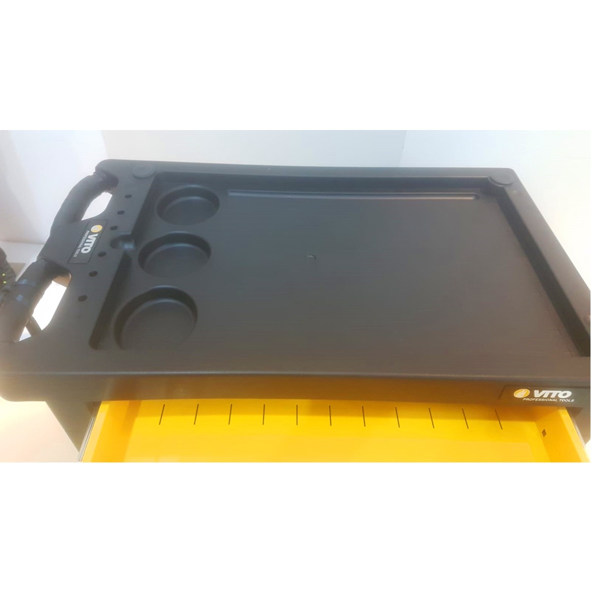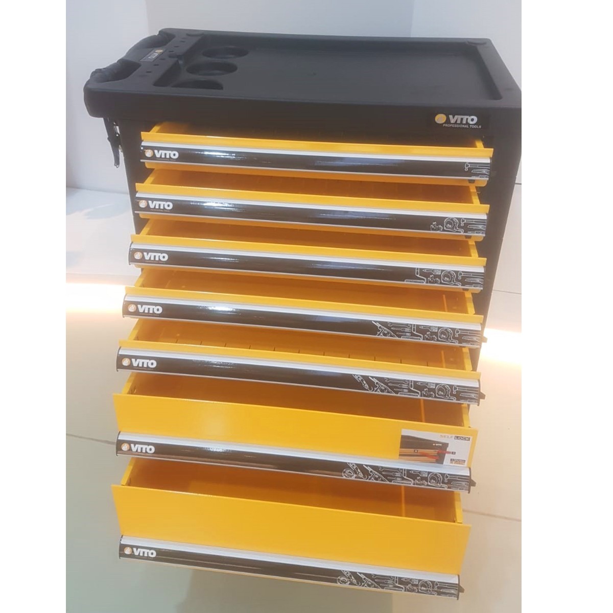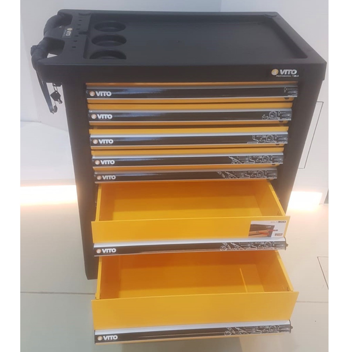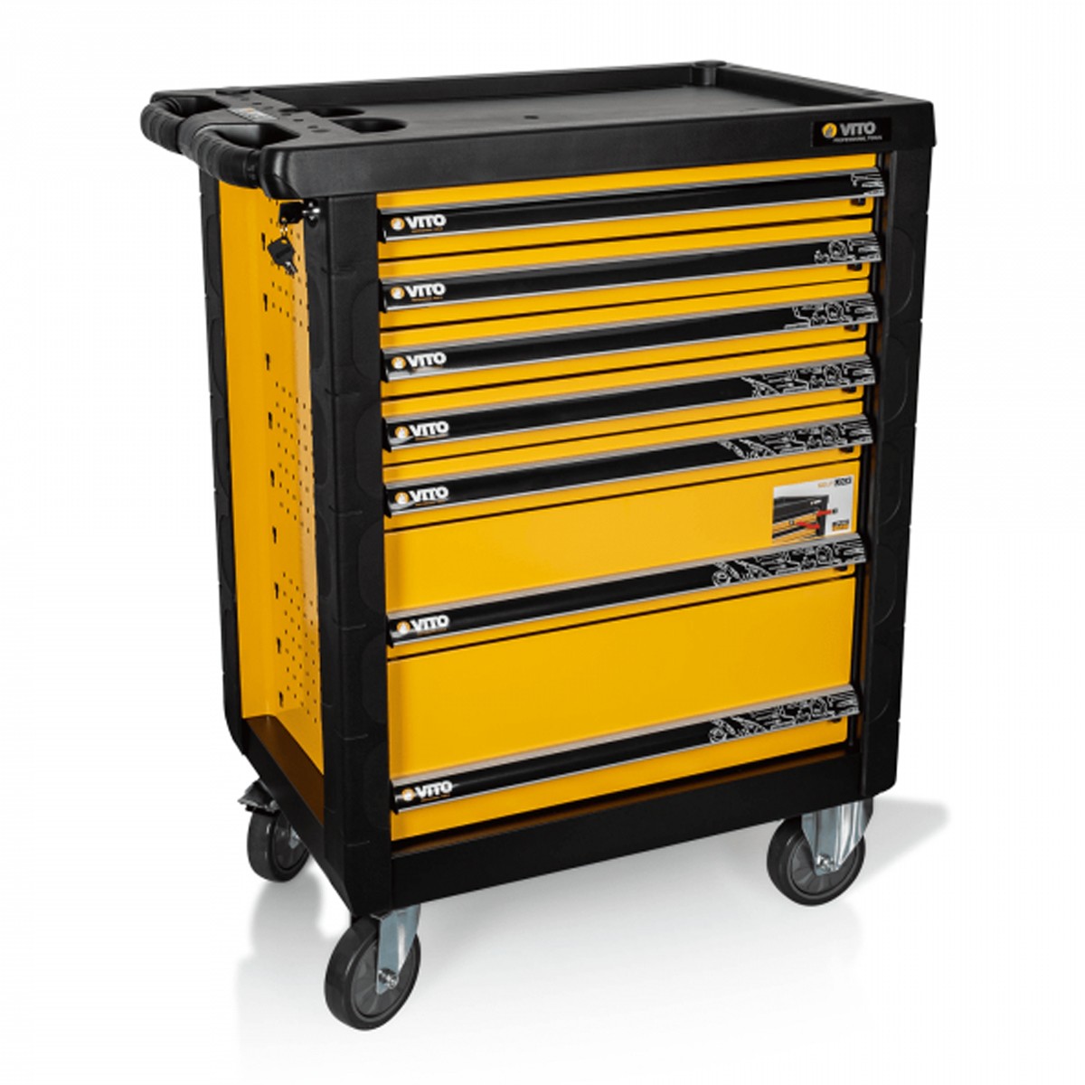La Servante d'atelier Professionnelle VITO 7 tiroirs est conçue pour une utilisation Professionnelle Sa structure renforcée est résistante aux chocs et résiste aux huiles . Dotée d'un Système de verrouillage centralisé avec serrure pour ranger vos outils et effets personnels en toute sécurité - Équipée de 2 Roues en caoutchouc diamètre 125 mm + 2 roulettes arrières pivotantes avec frein pour un déplacement facile même pleine et chargées - Composée de 5 tiroirs hauteur 65 mm, capacité 25 kg + 1 tiroir hauteur 135 mm capacité 35 kg + 1 tiroir hauteur 205mm capacité 35kg Son plateau supérieur de 685 x 465 mm est une surface de travail utile et pratique pour bricoler ou poser un étau . Dotée d'une enduction PVC caoutchoutée antidérapante , elle vous aidera à déposer votre électro portatif ou vos éléments de quincaillerie pour travailler en tout confort comme un mini établi .Côtés perforés pour stockage supplémentaire de pièces ou crochets Tiroirs coulissants avec glissières sur roulement à billes. Dimensions : 770 x 465 x 970 mm Poids: 29kg