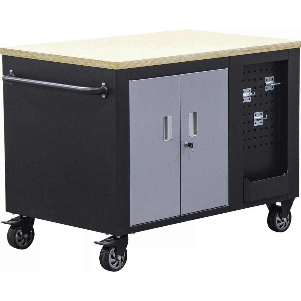 - 2 compartiments de rangement avec paroi en tôle perforée au-dessus pour suspendre les outils et autres ustensiles, y compris jeu de crochets