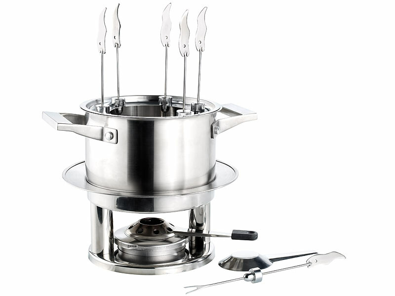 Pour fondues fromage, bouillon et vin Pour une fondue chinoise, bacchus ou savoyarde, vous pourrez régaler jusqu'à 6 convives après avoir fait chauffer le fromage ou le bouillon sur votre plaque de cuisson habituelle. Car le caquelon en acier inoxydable est compatible toux feux : gaz, électricité, etc, et même induction. Le double fond assure une répartition homogène et rapide de la chaleur. Régalez-vous en famille ou entre amis. Grâce au prix mini de ce service à fondue, il vous reste encore de quoi acheter le fromage ! Service à fondue en acier inoxydable pour 6 personnes par Rosenstein & Söhne Idéal pour les fondues savoyardes ou chinoises Caquelon en acier inoxydable avec double fond Compatible tous feux, même induction Anneau à poser sur le caquelon : support pour les fourchettes à fondue Avec 6 élégantes fourchettes à fondue en acier inoxydable Sécurité du brûleur (fonctionne avec de la pâte combustible) Contenu : service à fondue avec anneau porte-fourchettes, réchaud, 6 fourchettes à fondue, brûleur avec couvercle Attention : le brûleur est conçu exclusivement pour une utilisation avec de la pâte combustible pour appareil à fondue (non fournie).