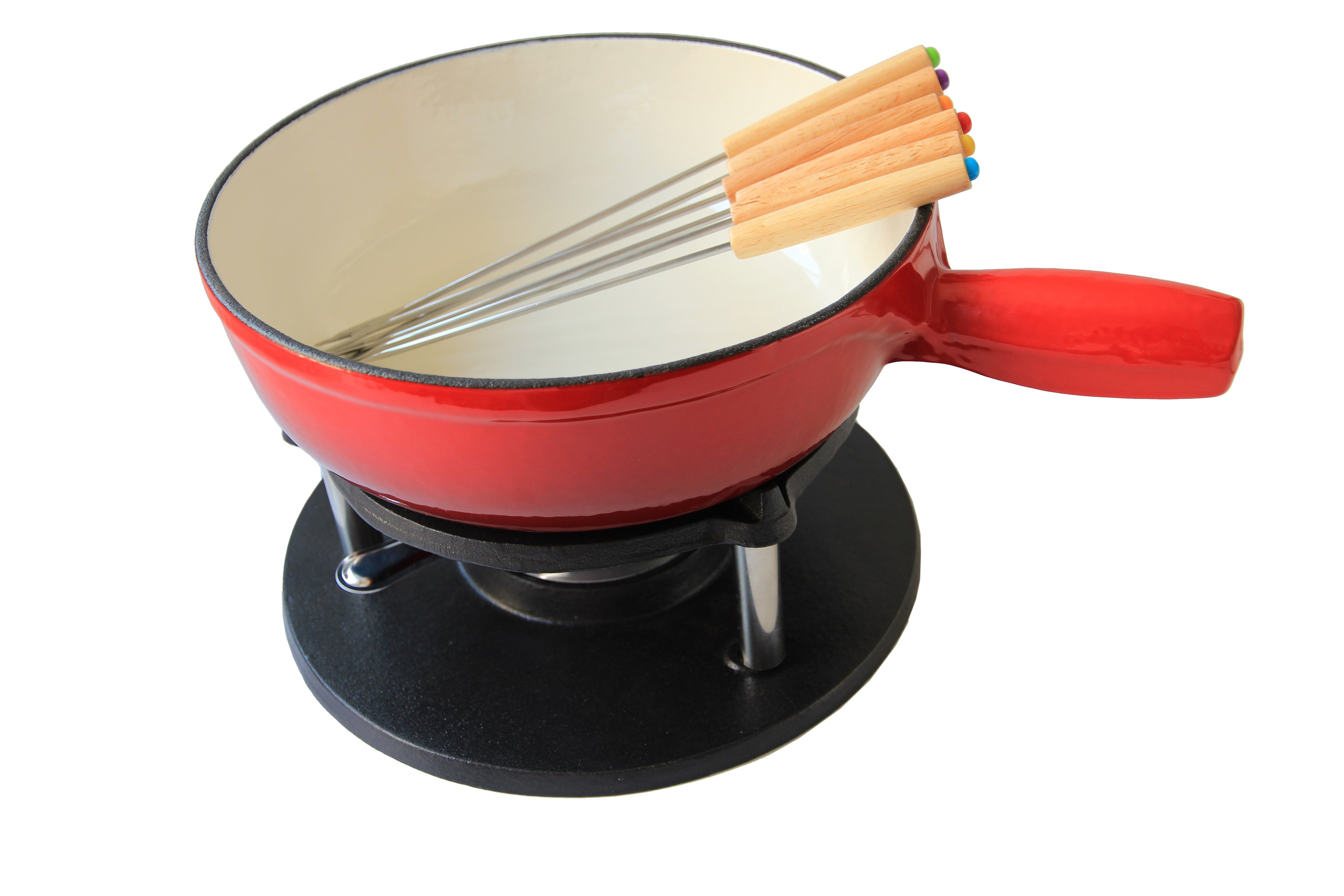 1 caquelon en fonte émaillée rouge dégradé 24 cm - 1 réchaud - 1 brûleur à pâte (pâte non fournie) - 6 fourchettes - caquelon tous feux et induction