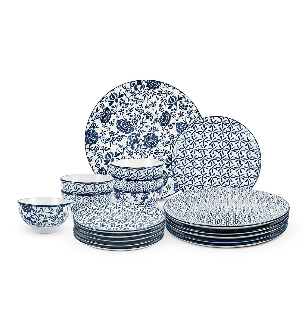 18 pièces : 6 assiettes plates, 6 assiettes dessert, 6 coupelles - 3 décors assortis