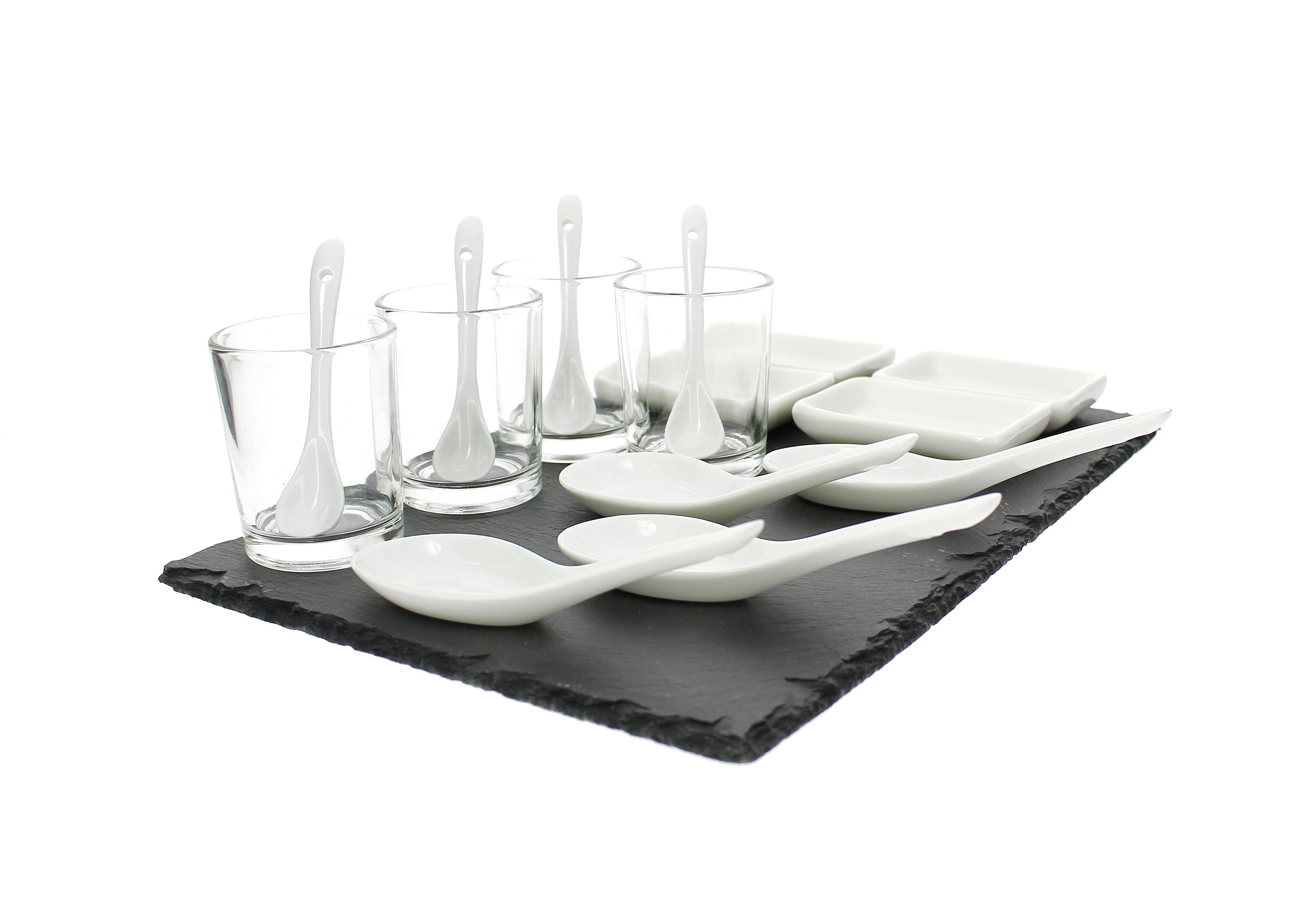 4 verrines droites en verre 4 cuillères en porcelaine 4 coupelles rectangulaires creuses en porcelaine 4 cuillères apéritives en porcelaine 1 plateau ardoise 30x20cm