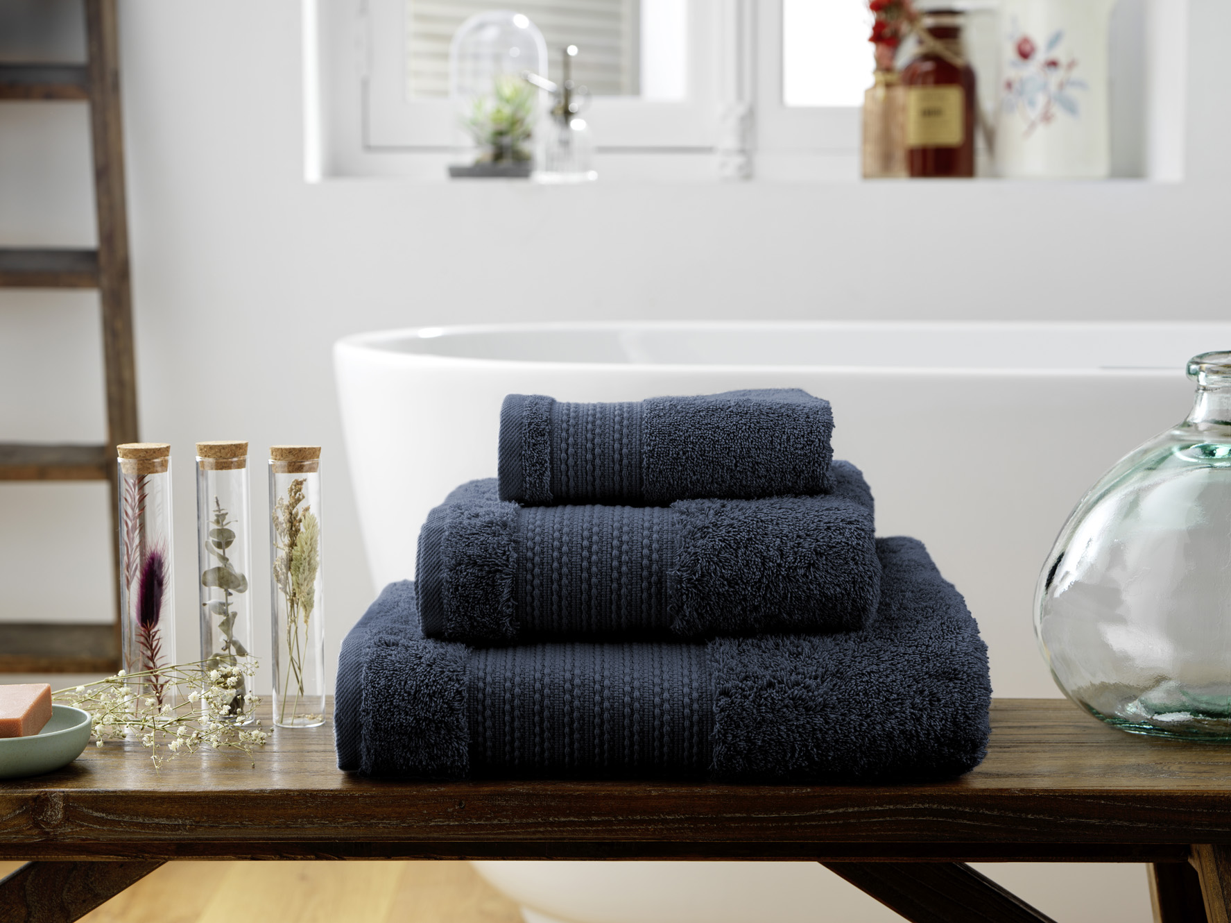 Serviette de toilette Cette serviette vous apportera douceur et confort, elle va devenir votre indispensable Dimensions: Largeur 50 cm x Longueur 90 cm Couleur: Bleu minuit Matiere: 100% coton produit à base de fibres issues de l'agriculture biologique (600gr/m²) Finitions: à liteau Entretien: Lavage jusqu'à 60°C (avec des couleurs similaires) - Sèche linge possible - Repassage possible Label OEKO-TEX garantit l'absence de substances nocives pour la santé et pour l'environnement tout au long du processus de fabrication Label Gots et BSCI Emballage éco-responsable, sans plastique Dans la même collection des Gants de toilette, des Tapis de bain Les accessoires presents sur les visuels ne sont pas vendus avec la serviette de toilette