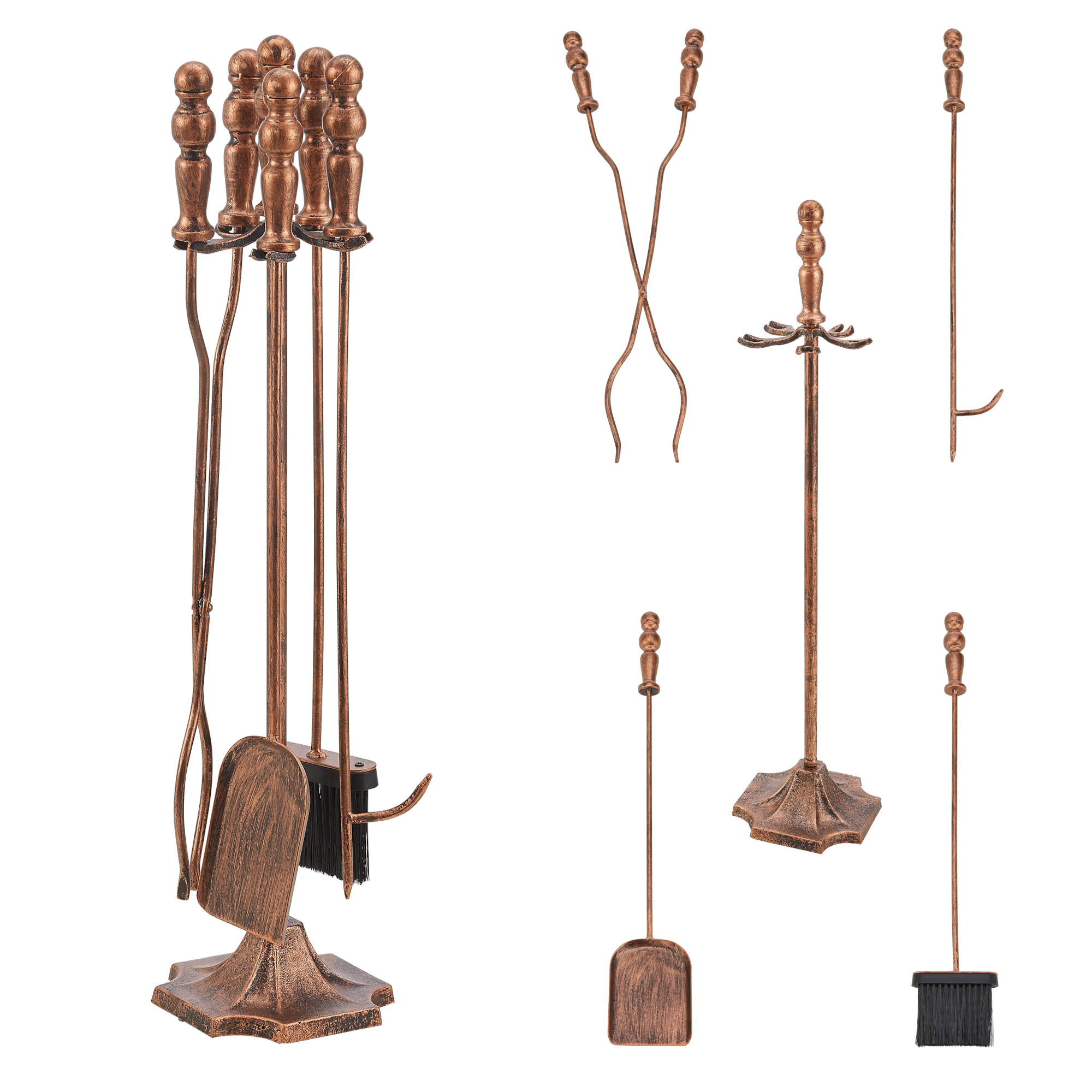 Le serviteur de cheminée se composent d'un support, d'un balai et d'une pelle à cendres, d'un pince à cheminée et d'un tisonnier. Les outils sont résistants à la chaleur, ainsi ils sont les accessoires parfaits pour allumer et maintenir le feu à la maison dans la cheminée ou en plein air. A l'aide du support, les accessoires suspendus sont toujours à portée de main.