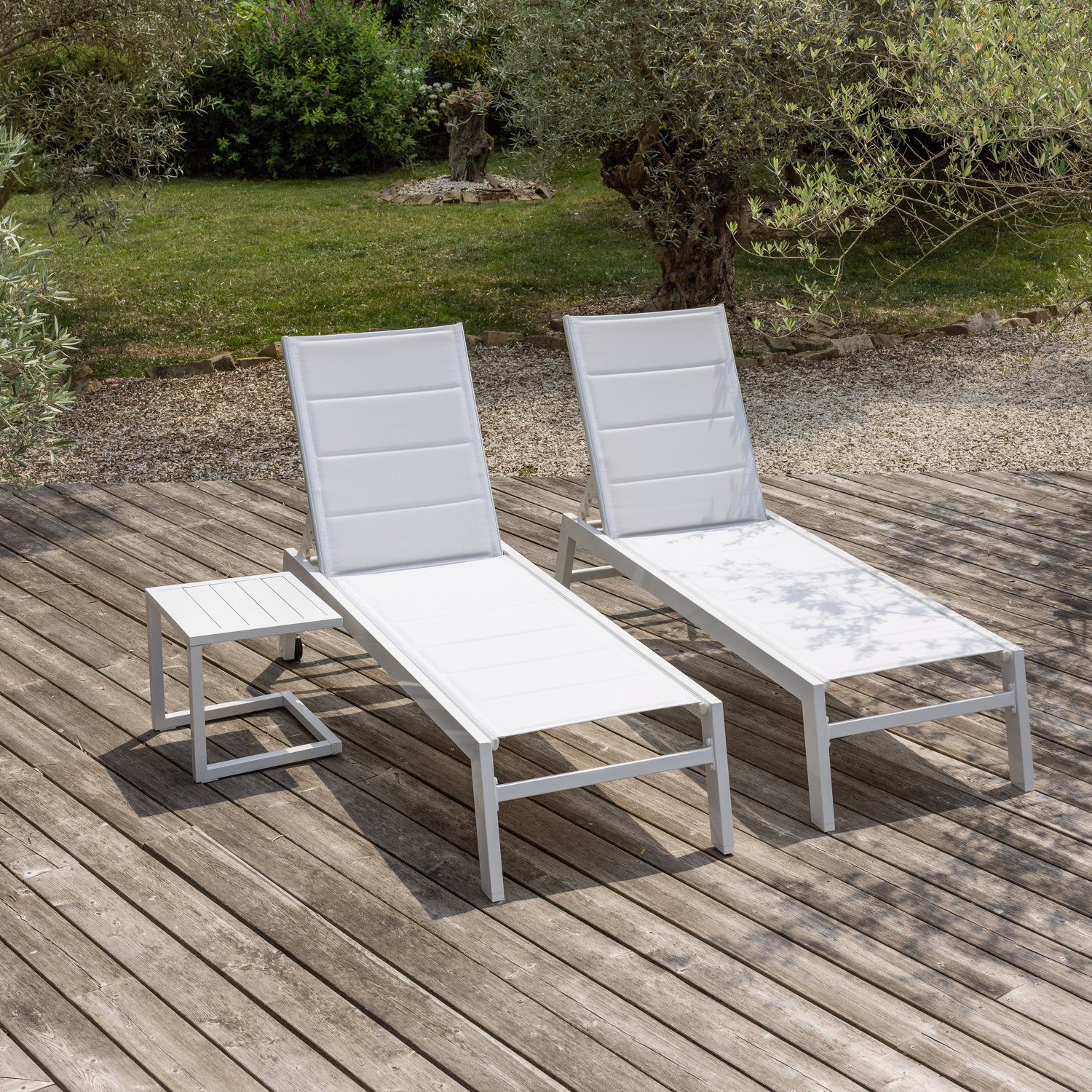 Set 2 bains de soleil et table d'appoint BARBADOS en textilène blanc - aluminium blanc