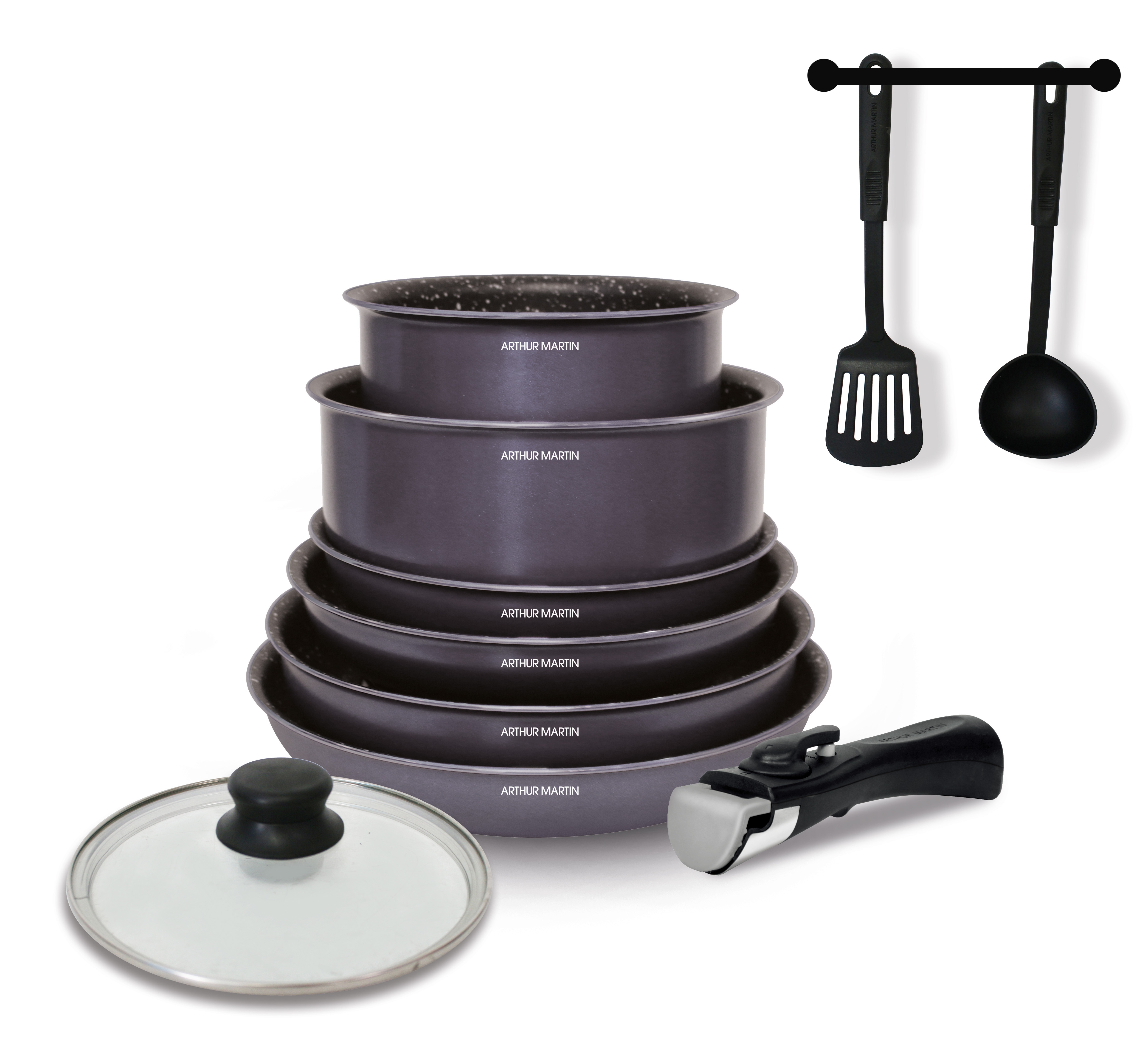 Batterie 10 pcs 3 poêles 20-24-28 2 casseroles Bec Verseur 16-18 1 sauteuse 24 3 couvercles en verre 16-18-24 1 poignée
