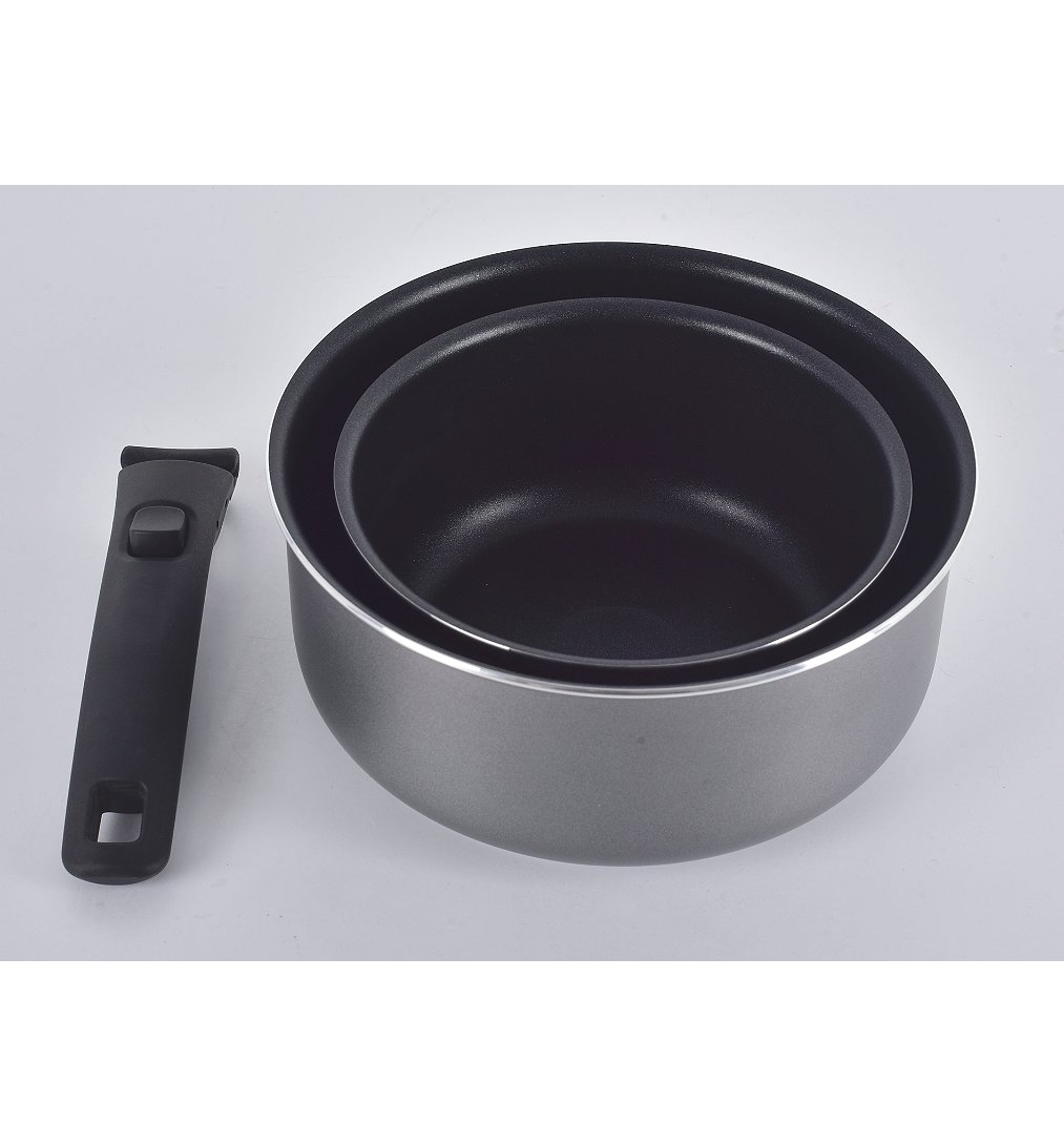 Set de 2 casseroles en aluminium - ø 16/20cm - manche amovible inclus - tous feux dont induction - revêtement intérieur anti-adhésif - couleur extérieure grise - compatible au four traditionnel jusqu'à 230° (hors manche)