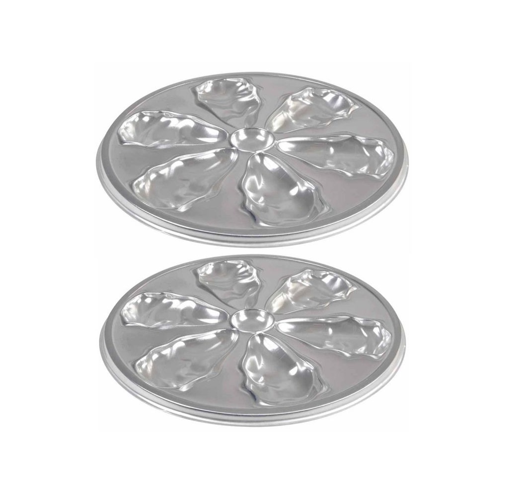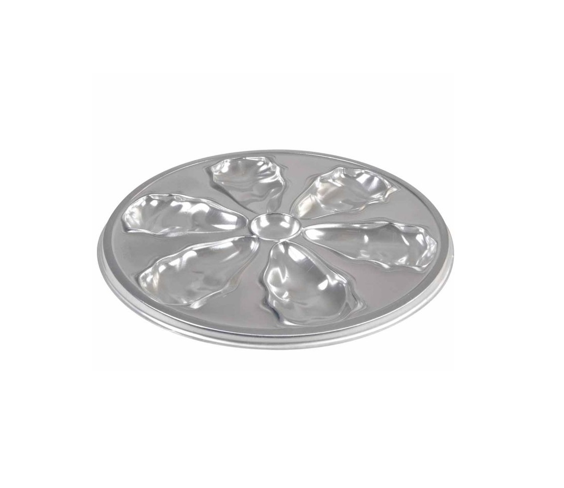 Set de 2 plateaux a huitres couleur argent Dimension des plateaux 25 cm de diametre Forme ronde Matiere : plastique Le plateau peut contenir 6 huitres, ideal pour une belle presentation.