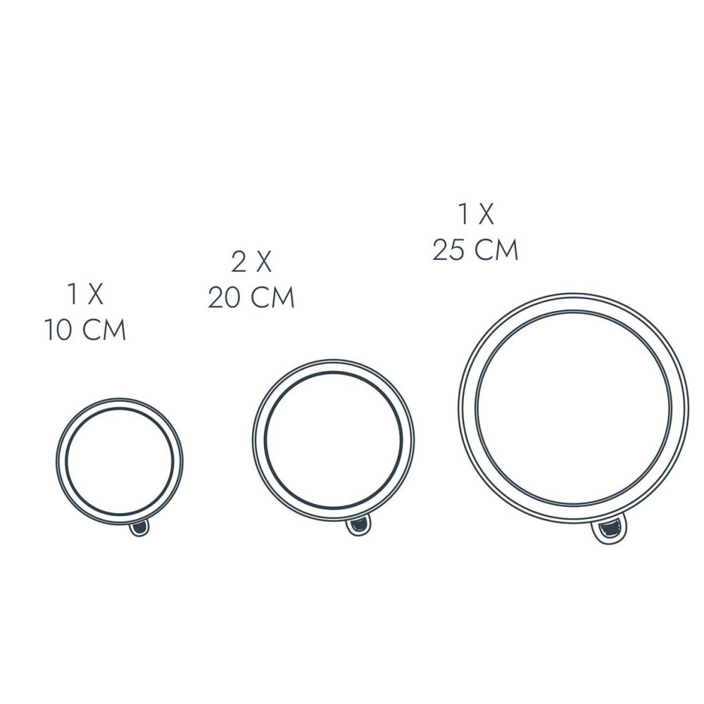 | Composition | Lot de 4 couvercles : 1 de 10 cm - 2 de 20 cm - 1 de 25 cm |