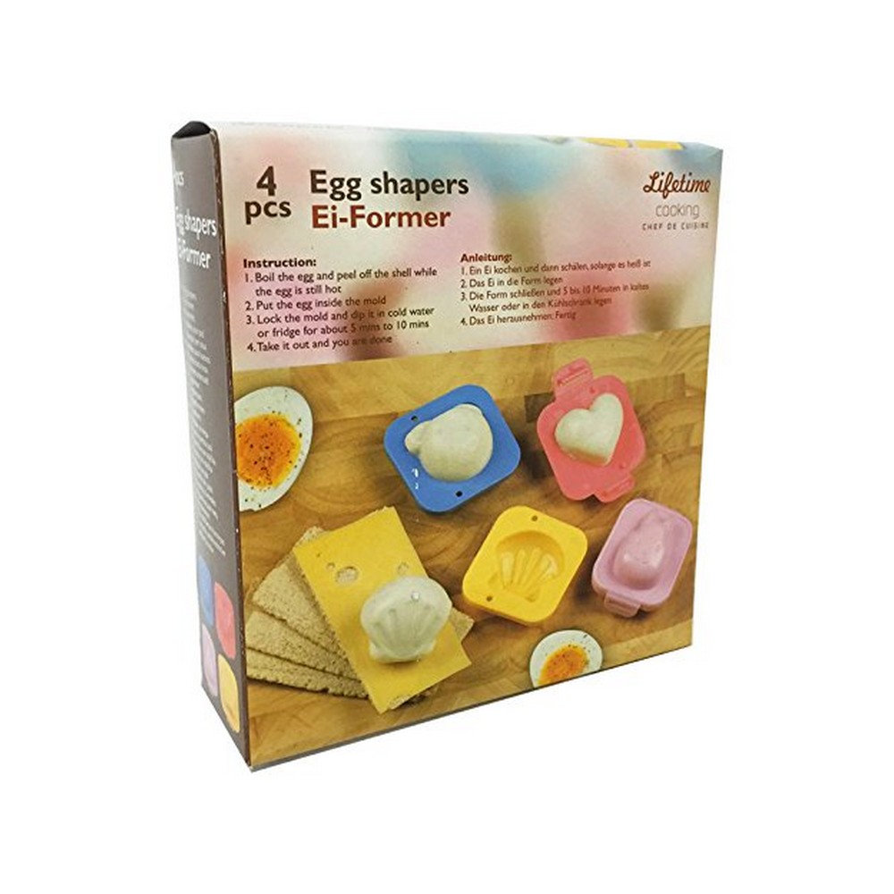 Set de 4 moules à oeuf dur : lapin , coquillage , coeur et ourson Ces moules permettent de donner une forme originales à vos oeufs durs Facile à utiliser et propre , réutilisable , durable , pratique . Dimension : 6.5 x 6.5 x 4 cm Matière : plastique