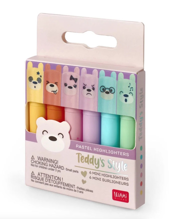 highlight your style ! le set de 6 mini surligneurs - teddy's style legami surlignent chaque nuance, qu'elle soit crazy (folle), happy (gaie) ou pretty (mignonne).