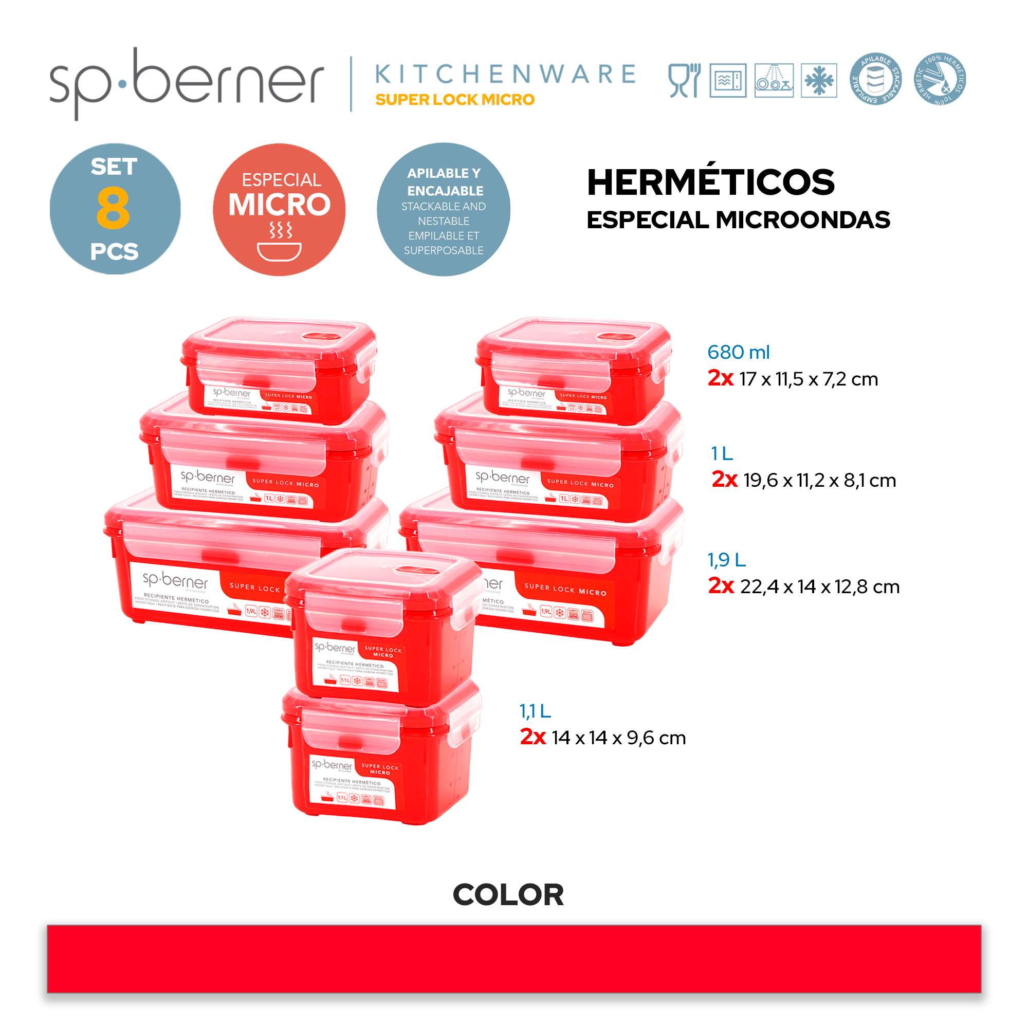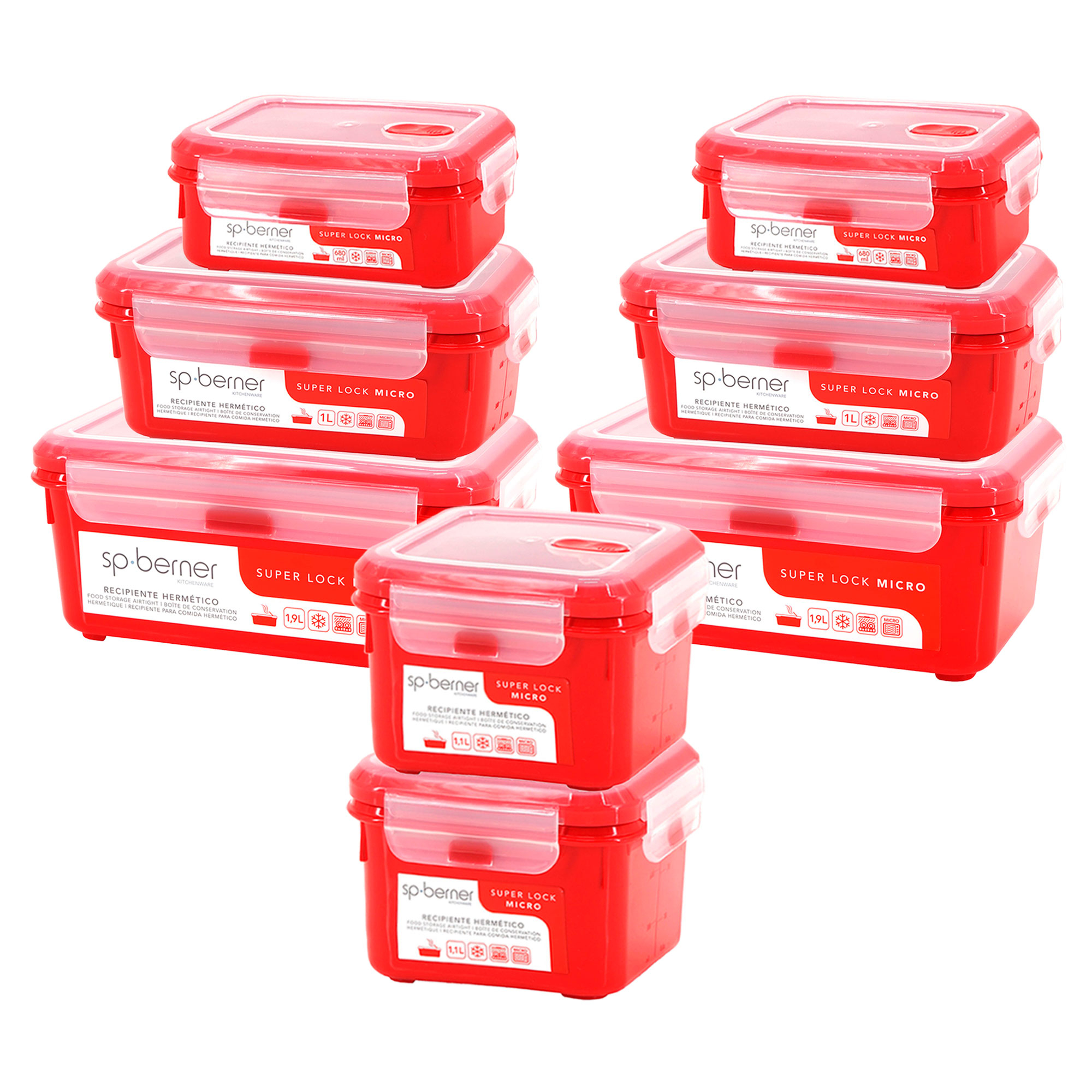 Libellé Set de 8 boîtes hermétiques SUPER LOCK MICRO 2x 0,68-1-1,1-1,9 L, adaptées à la cuisson à la vapeur au micro-ondes, idéales pour le transport et la c