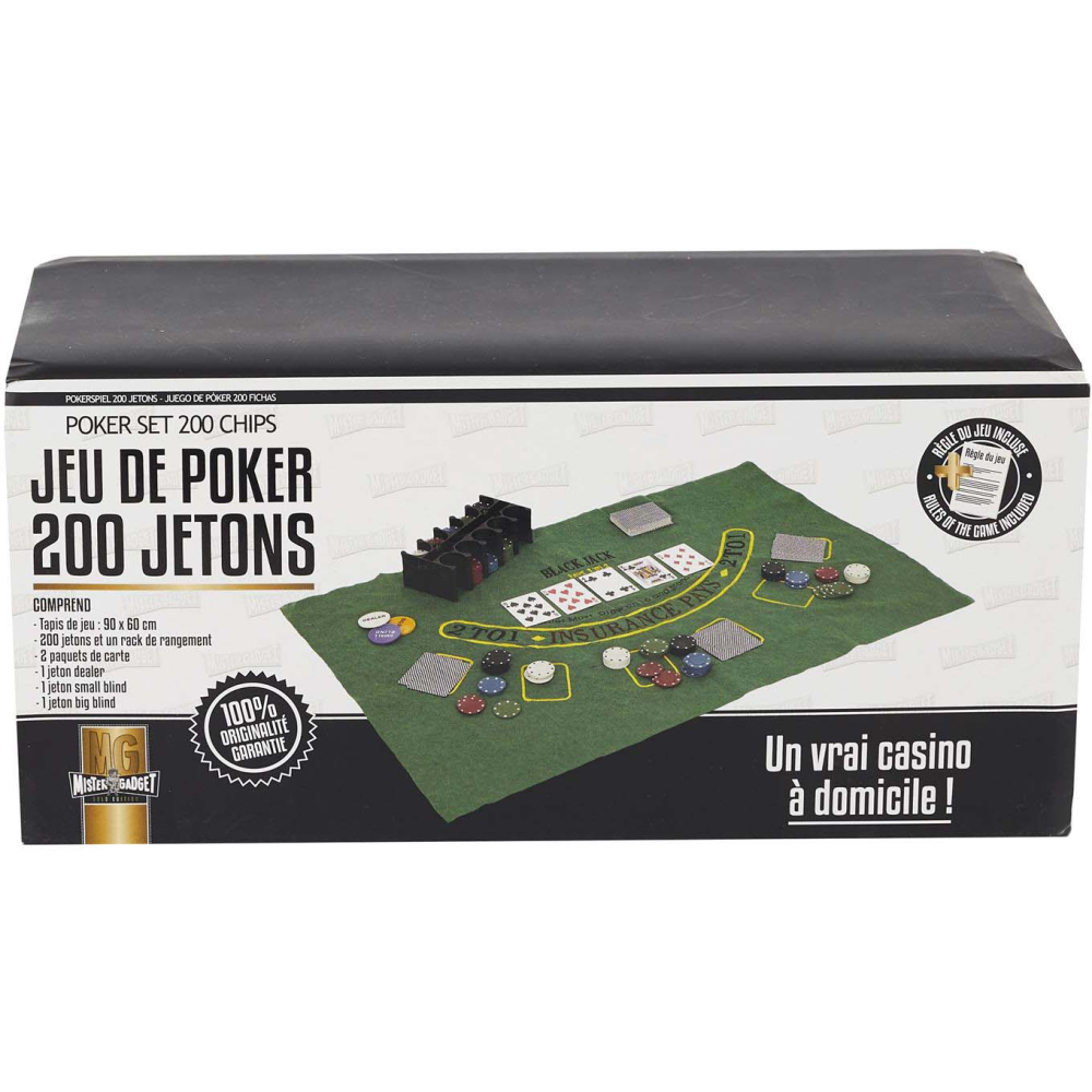 | Composition | Un tapis de jeu 90 x 60 cm + 200 jetons et rack de rangement + 2 paquets de cartes + 1 jeton dealer + 1 jeton small blind + 1 jeton big blind |