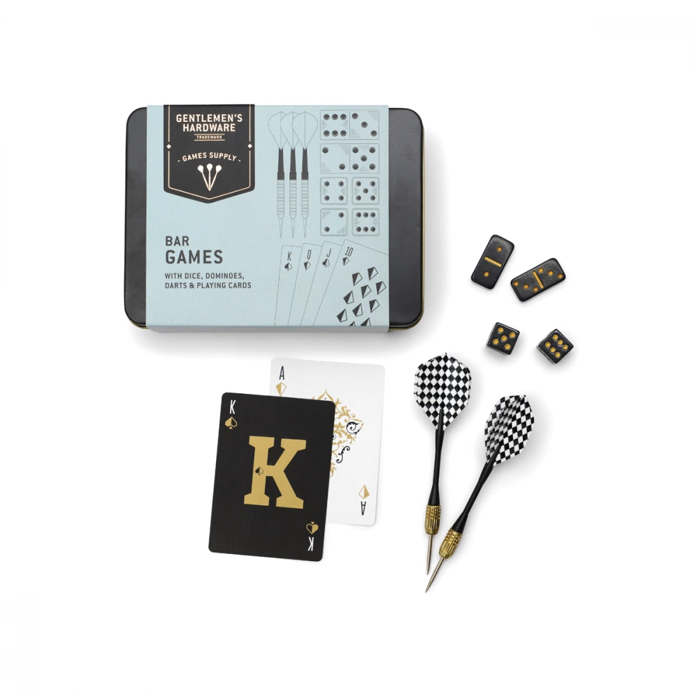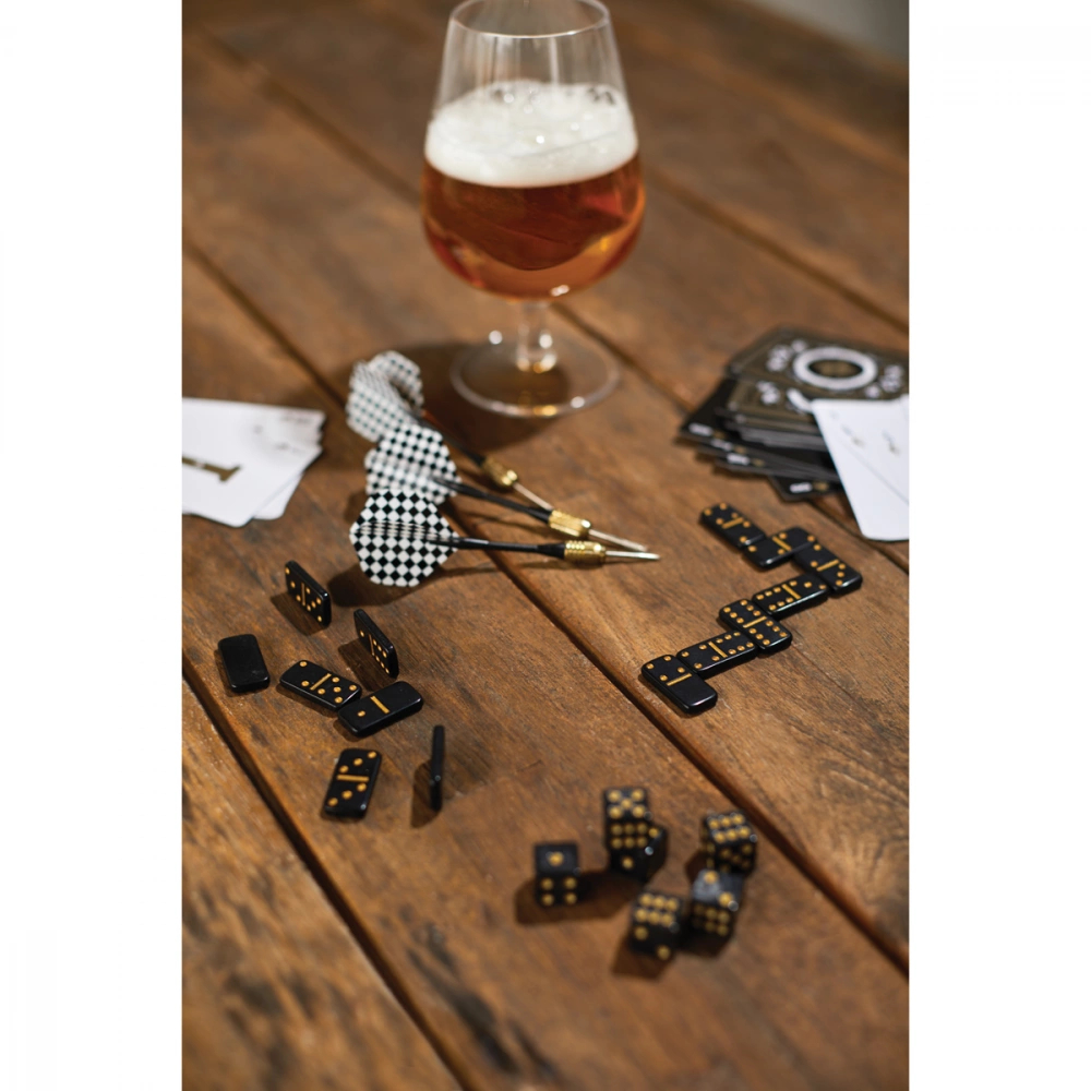 Cette boite de jeux est parfaite pour passer des soirées entre amis ou en famille en s'exerçant aux fléchettes, à la belote, aux dominos ou encore au Yams. Très pratique car facilement transportable, ce set de jeux vous accompagnera partout où vous le souhaitez. Contient 28 dominos, un jeux de carte, 6 dés, 3 fléchettes et 1 livret d'instruction. Dimensions : 16 x 11.5 x 4.5 cm Matière : Boite en métal
