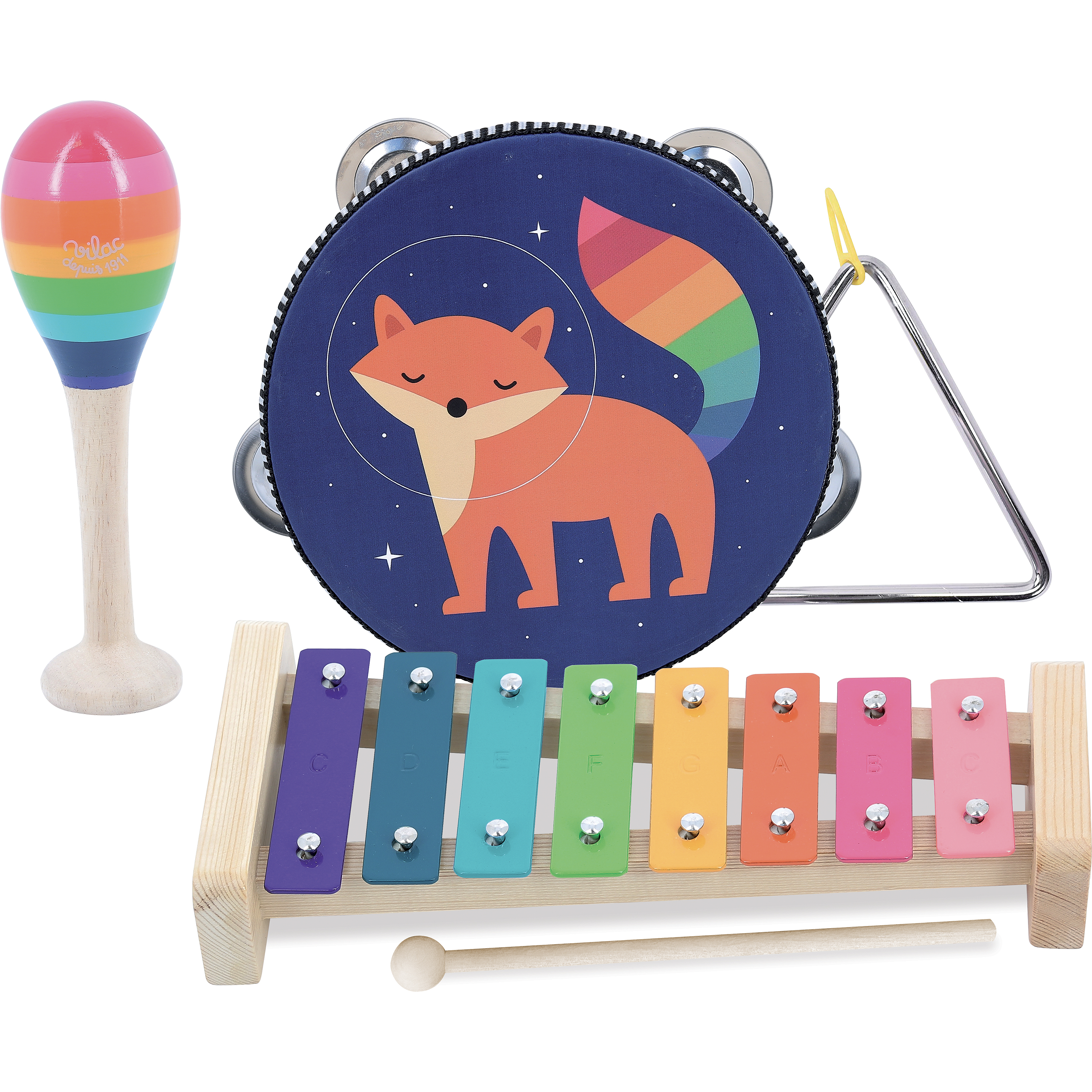 Un joli tambourin avec une tête de lion illustrée avec poésie par Andy Westface dans les tons arc-en-ciel. Il est composé d'un métallophone, d'un triangle, d'une maracas et d'un tambourin. Formidables supports pour initier les petits dès 3 ans aux joies des percussions, des mélodies et du rythme, ils leur permettent de développer leur écoute et leur créativité. En avant la musique, que le spectacle commence !!!