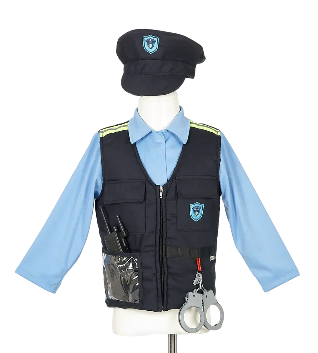 Ce set contient une veste de policer, une casquette assortie, des menottes, un talkie-walkie et une matraque de police. Vous pouvez également ajouter ou retirer trois inscriptions POLICE en anglais, espagnol et allemand à coller dans le dos grace au velcro.