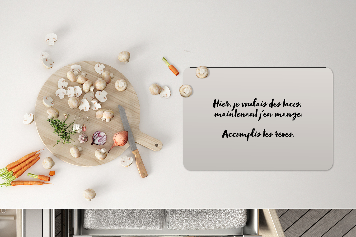 Citation française : 'Hier, je voulais des tacos, maintenant j'en mange. Accomplis tes rêves'.