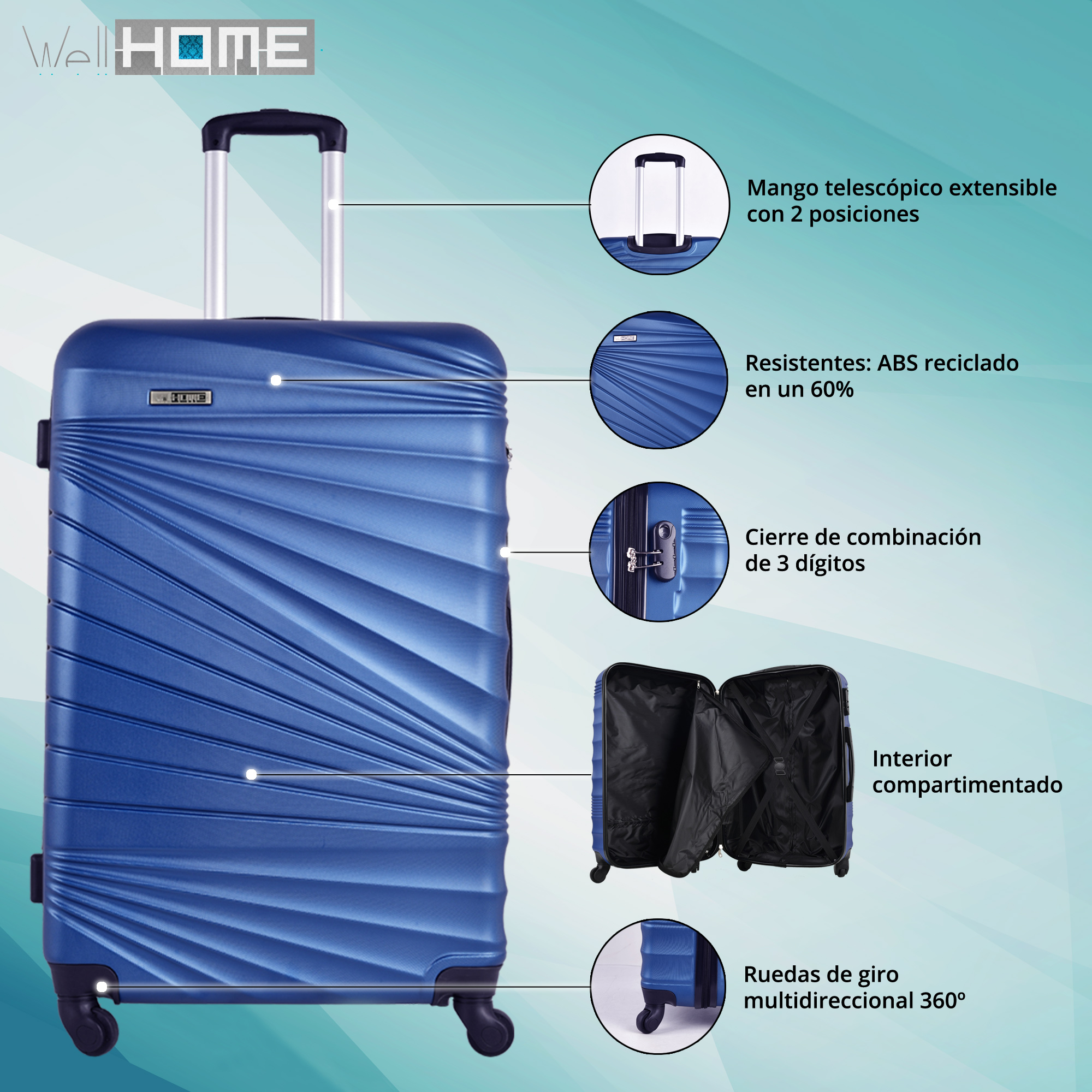 JEU DE VALISES RIGIDES : Valise cabine L.36xP.22xH.56CM / Capacité : 37 L. / 2,26 Kg. / Valise Moyenne L.44xP.25xH.66CM / Capacité : 63 L. / 2,75 Kg Trousse de toilette L.30xP. 17xH.23CM Capacité : 11 L. / 0,66 Kg. MATÉRIAU DE HAUTE QUALITÉ, DURABLE ET ÉCOLOGIQUE : Composé à 60 % d'ABS recyclé. L'ABS garantit une grande capacité d'absorption des chocs tout en apportant légèreté, durabilité et résistance même à basse température. FACILITÉ DE TRANSPORT : Ensemble de valises avec une poignée télescopique en aluminium extensible sur 2 positions et une poignée supérieure supplémentaire pour une meilleure prise en main. Ses 4 roues tournantes multidirectionnelles à 360º facilitent le déplacement sans avoir à traîner votre poids. SÉCURITÉ : Toutes les pièces contiennent une serrure à combinaison à 3 chiffres sur le côté. OPTIMISATION DE L'ESPACE ET DE L'ORGANISATION : Intérieur compartimenté avec doublure. Une partie comprend des sangles de fixation élastiques réglables et l'autre un séparateur zippé pour optimiser l'organisation. Grand gain de place en pouvant ranger l'un dans l'autre.