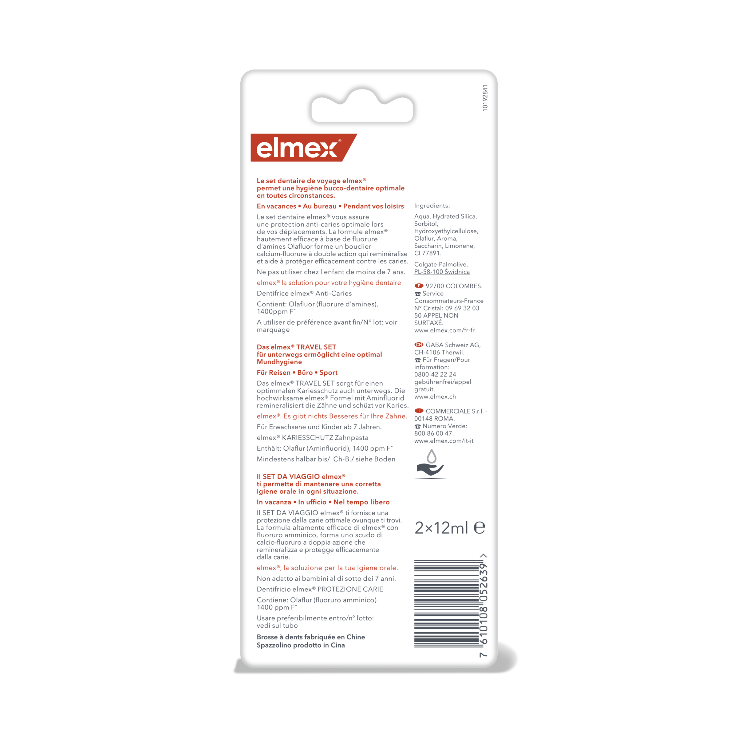 | Libellé | Set dentaire de voyage elmex anti-caries - 1 brosse à dents + 2 mini dentifrices 12ml |