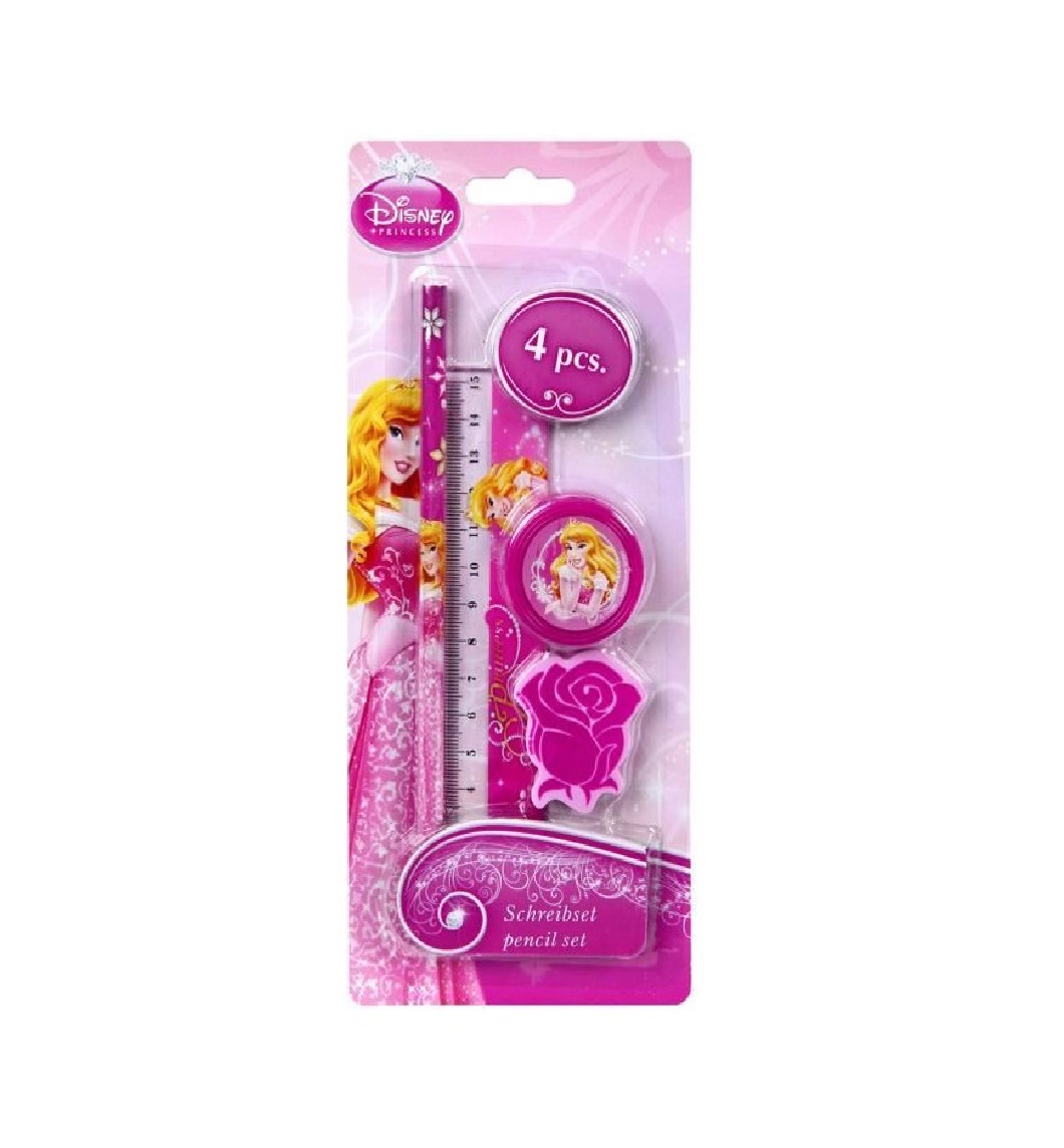 Retrouve ton héroine Aurore sur ce superbe ensemble de papeterie. Set papeterie contenant: - 1 crayon à papier - 1 gomme - 1 règle - 1 taille-crayon En emballage blister.