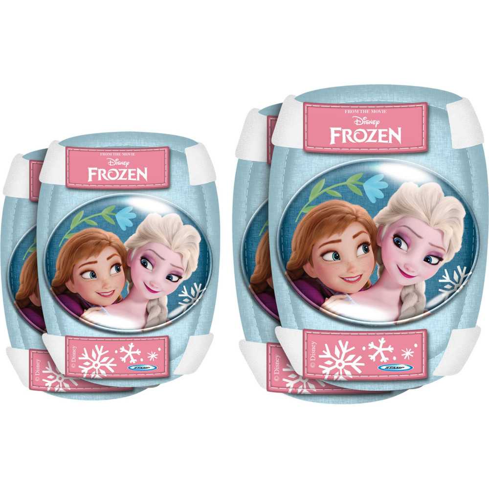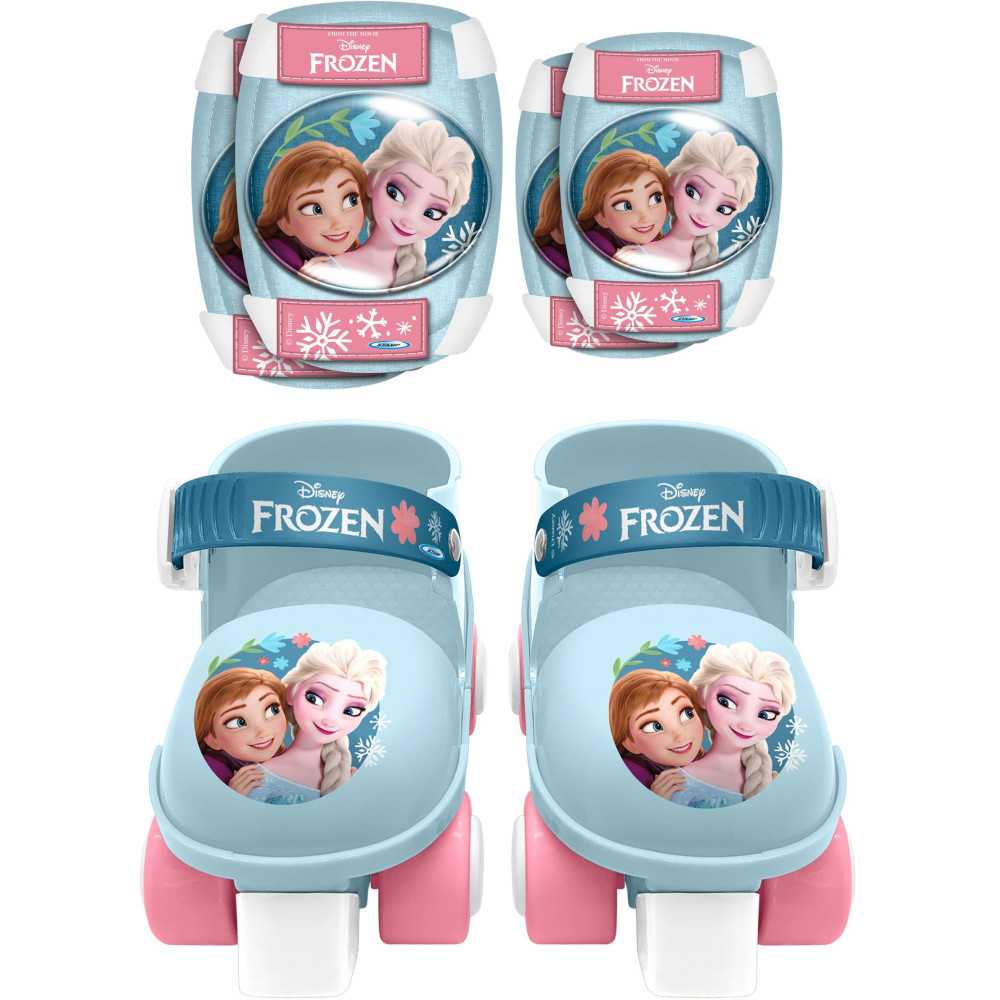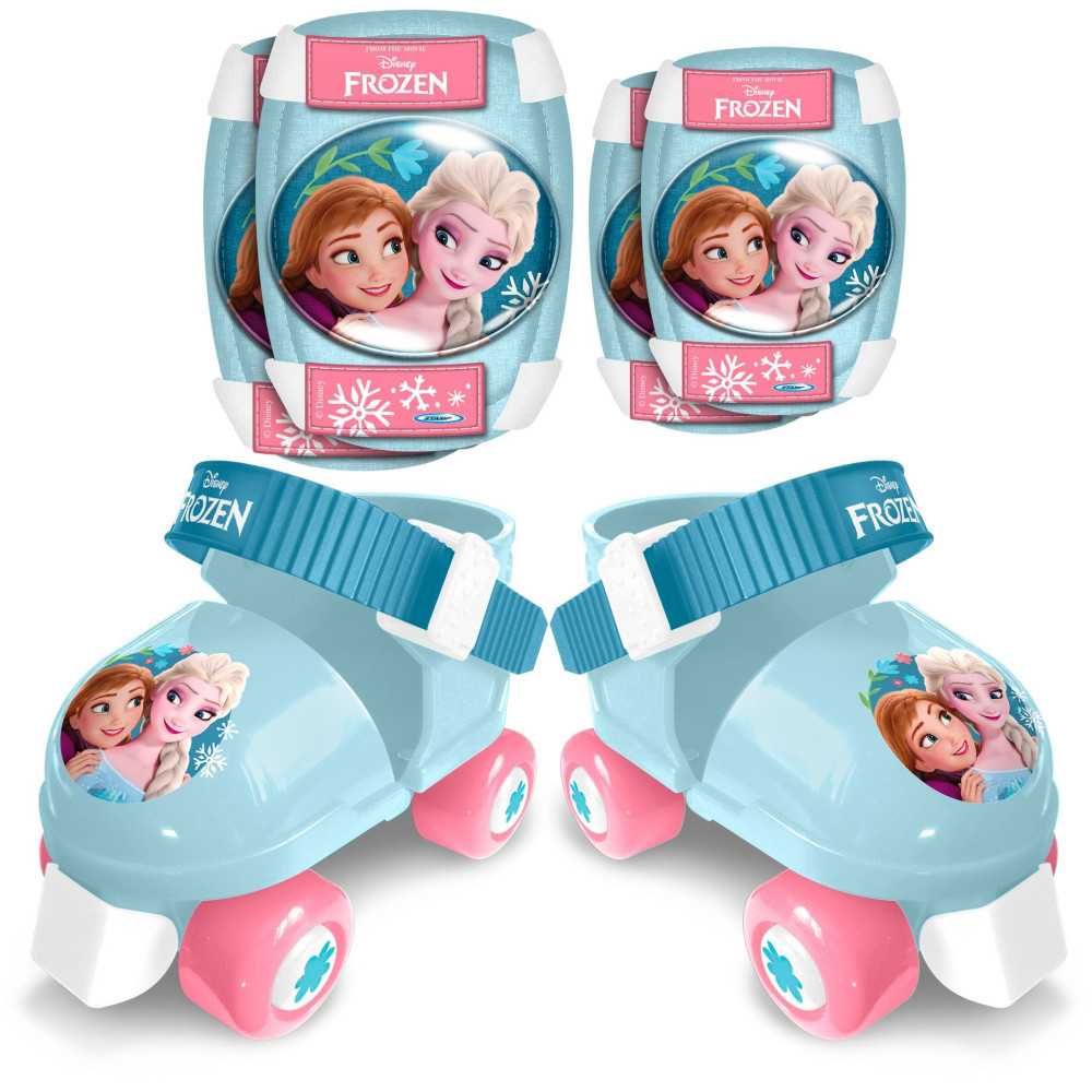 | Plus produit | Set patins quad ajustables taille 23/27 avec protections assorties (coudières et genouillères), coques plastiques rigides, sangles à clip et velcro, design Disney Frozen Anna & Elsa, stopper avant blanc, roues colorées. |