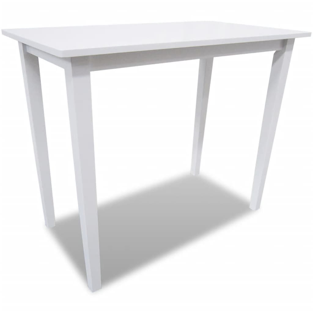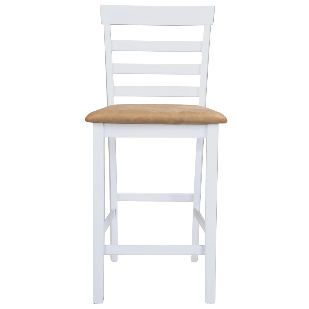 Ce set composé d'une élégante table et de 4 chaises de bar stylées sera un excellent ajout dans votre cuisine ou salle à manger. Le design élégant de ce set en fait un accessoire indémodable pour votre maison. Grâce au plateau plaqué en bois véritable et aux pieds en hévéa, cette table de haute qualité est facile à nettoyer. Les chaises ont un cadre robuste et durable en hévéa et grâce à leur assise rembourrée en mousse, elles sont très confortables. Cet ensemble de meubles ajoutera une touche rustique charmante à votre espace de vie! La livraison comprend 1 table et 4 chaises de bar blanches. Table: Couleur : blanc Dimensions : 110 x 60 x 90,8 cm (L x l x H) Matériaux: MDF avec placage en bois véritable (plateau) + hévéa massif (pieds) Chaises: Couleur : cadre blanc + siège beige Dimensions : 41 x 49 x 96 cm (l x P x H) Profondeur du siège : 40 cm Hauteur du siège à partir du sol : 62 cm Matériau : cadre en bois d'hévéa + siège en tissu La livraison comprend 1 table et 4 chaises de bar blanches Matériel: Polyester: 100%