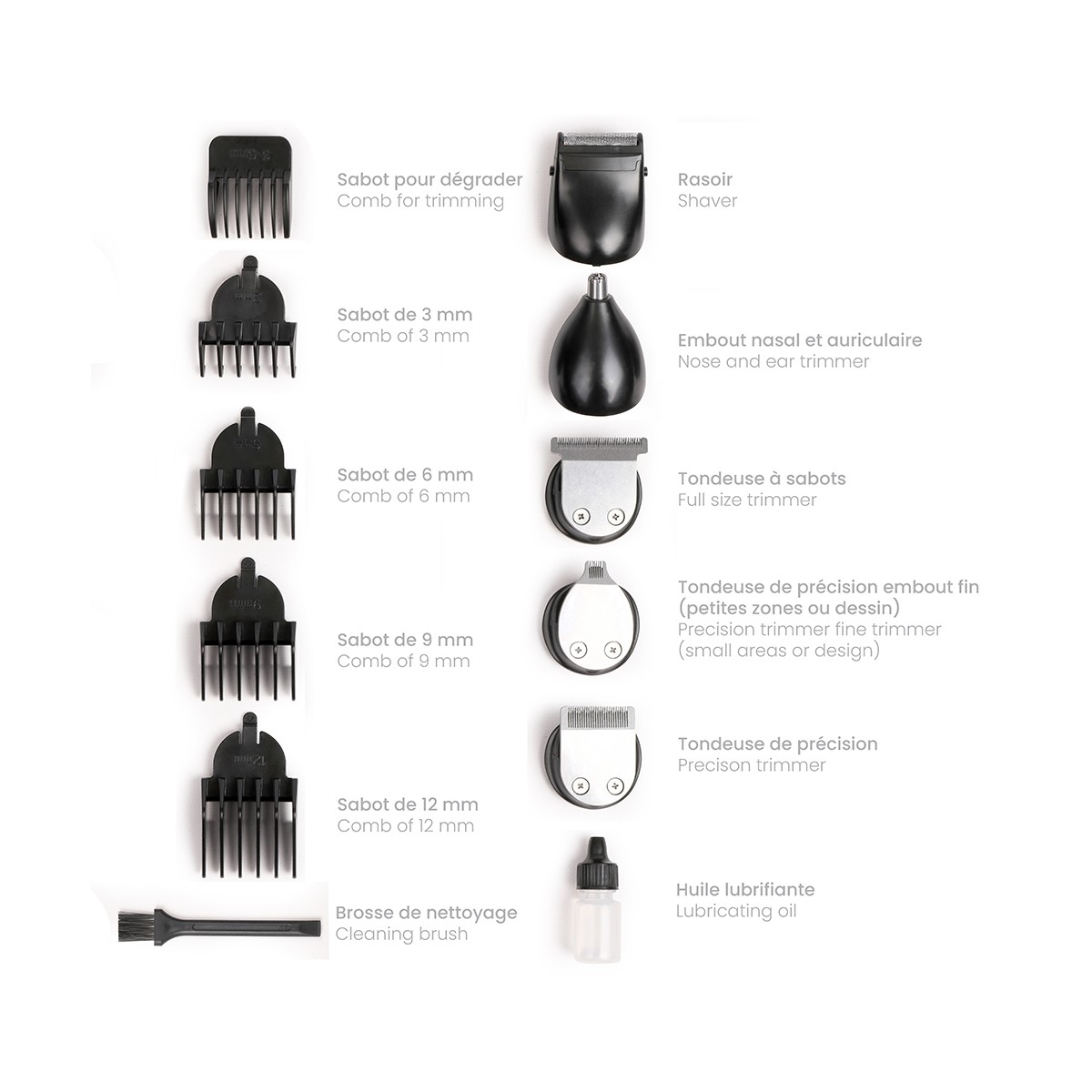 | Accessoires inclus | 5 têtes interchangeables (Sabots, Rasoir grille, Embout nez et oreille, Tondeuse de prévision et corps), Câble de charge USB, Peigne, Socle de rangement, Huile lubrifiante, Brosse de nttoyage |