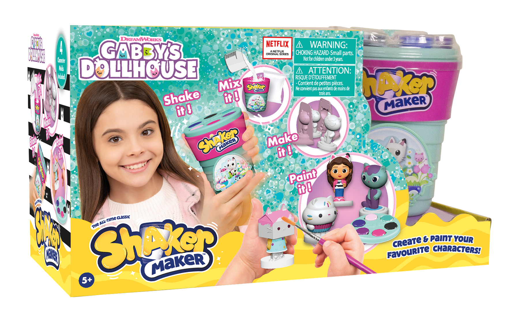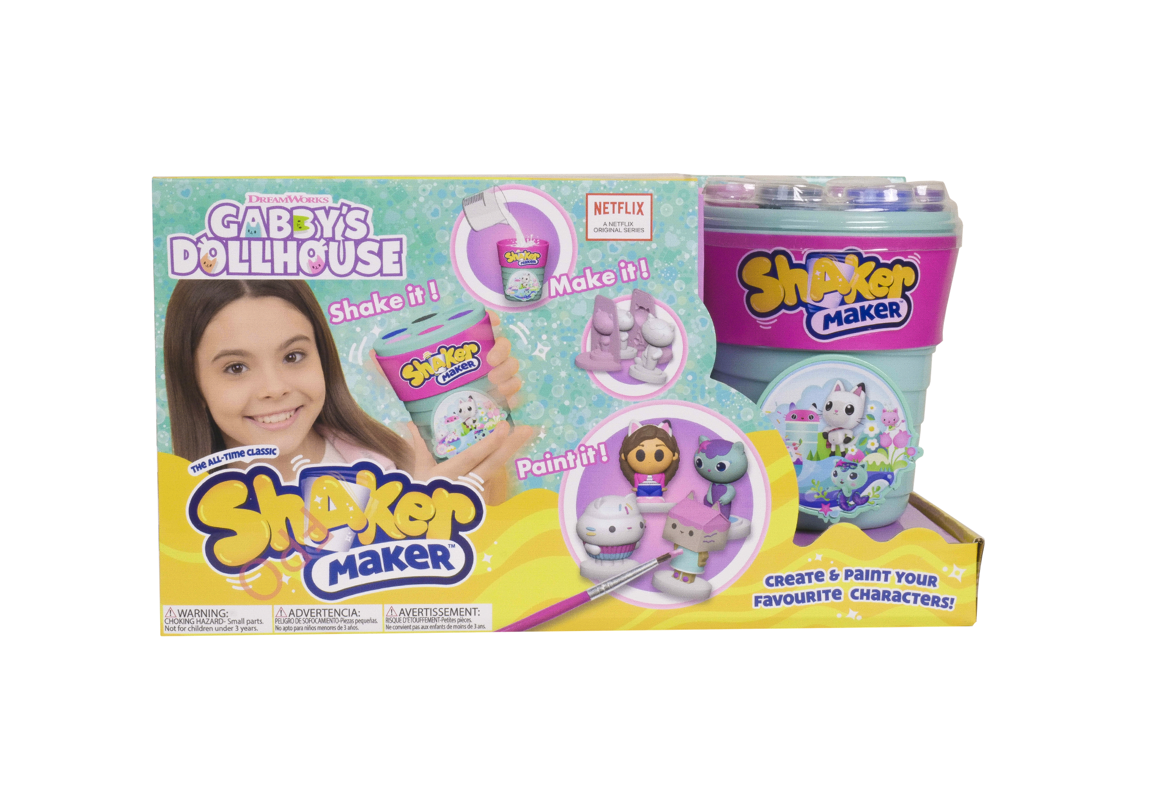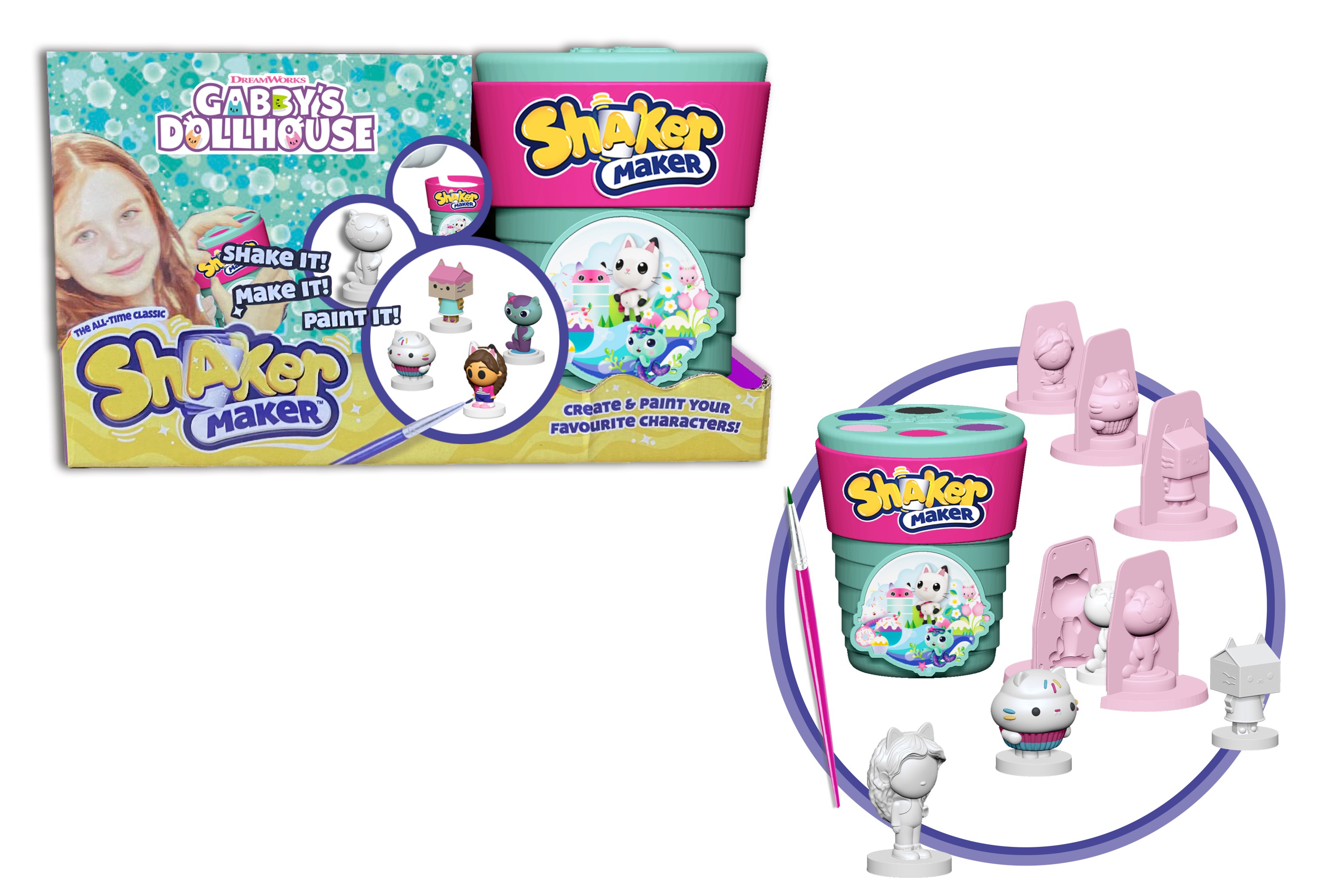 "Shaker Maker - Gabby et la maison magique Mélange la poudre avec l’eau. Secoue, secoue.... Laisse sécher et démoule. Décore tes personnages avec la peinture et le pinceau. Inclut : 1 x Shaker Maker 4 x moules 1 x Peinture 6 couleurs 1 x Pinceau 300g x Mélange de poudre (10 moulages)"