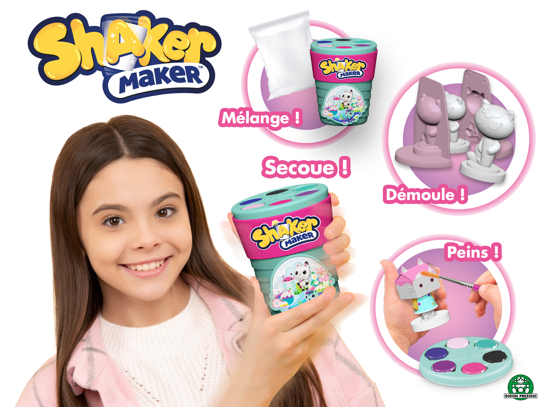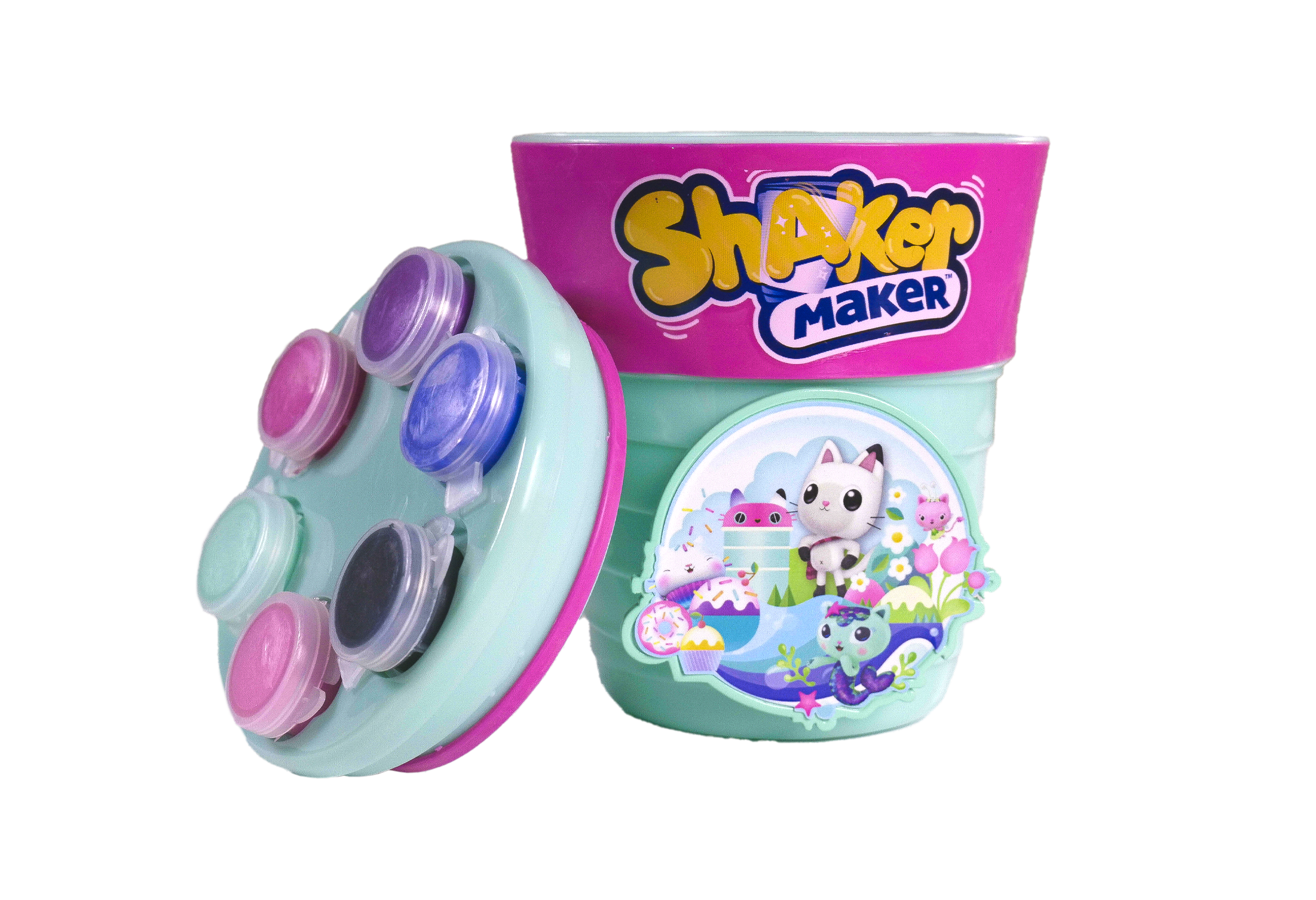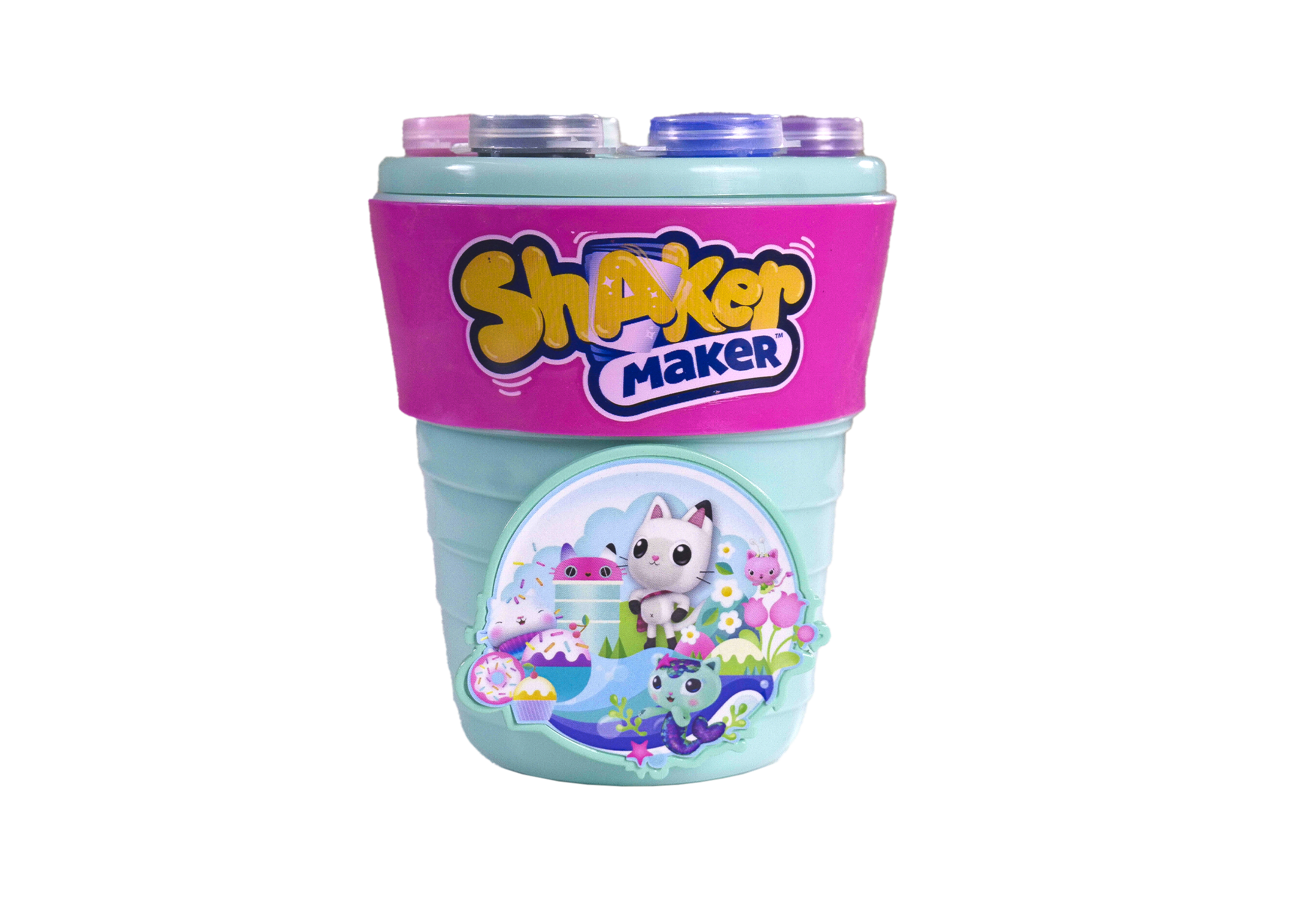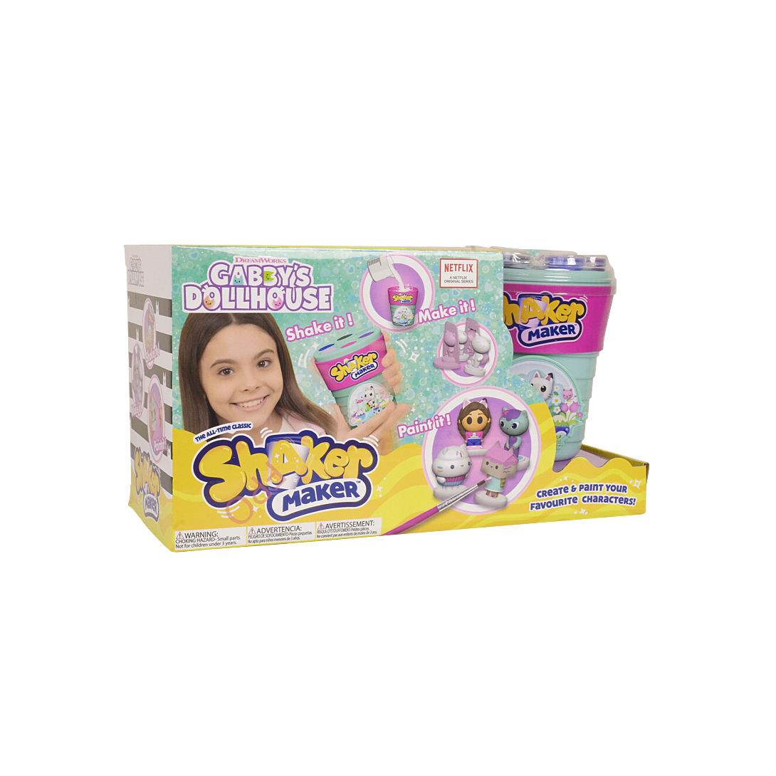 "Shaker Maker - Gabby et la maison magique Mélange la poudre avec l’eau. Secoue, secoue.... Laisse sécher et démoule. Décore tes personnages avec la peinture et le pinceau. Inclut : 1 x Shaker Maker 4 x moules 1 x Peinture 6 couleurs 1 x Pinceau 300g x Mélange de poudre (10 moulages)"