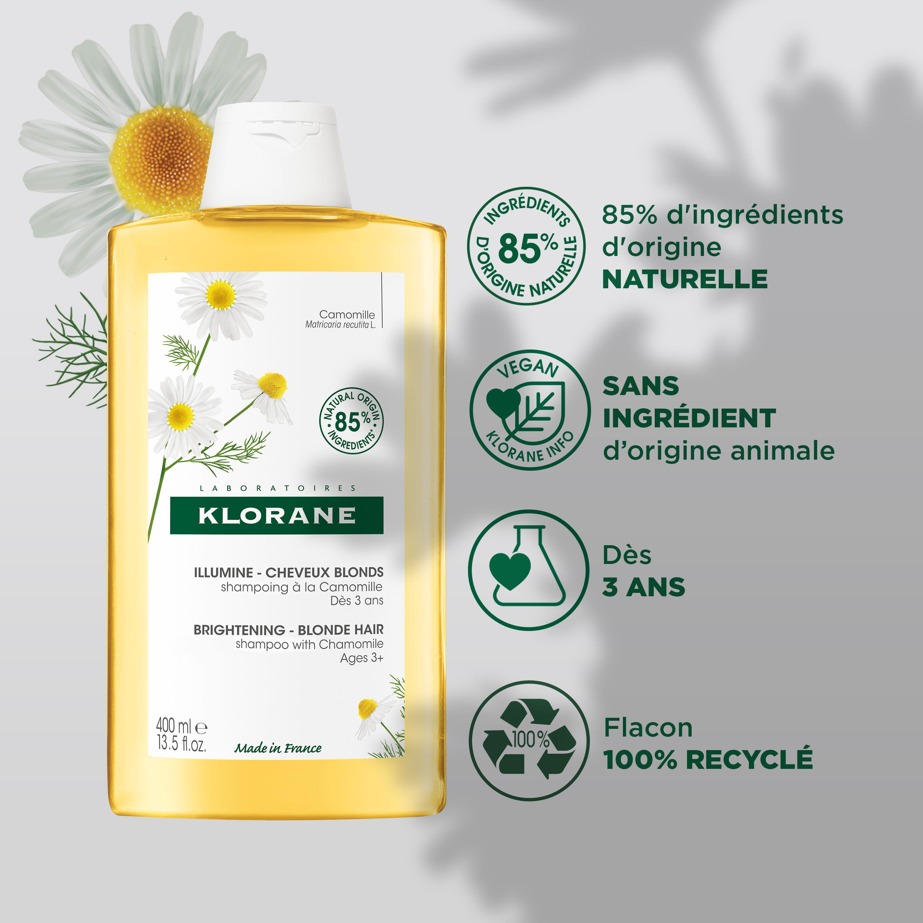 Utilisable dès 3 ans, le Shampoing illuminateur à la Camomille BIO de Klorane nettoie en douceur les cheveux et apporte des reflets dorés naturels aux cheveux blonds naturels, méchés ou colorés. Sa formule haute tolérance à 85 % d’ingrédients d’origine naturelle et biodégradable* lave les cheveux avec douceur. La Camomille, riche en pigments jaunes naturels, est traditionnellement utilisée pour éclairer délicatement toutes les nuances de blonds. La chevelure s’éclaircit subtilement et s’illumine de reflets dorés pour des cheveux doux, propres, légers et brillants de lumière. *Selon la norme OCDE 301B.