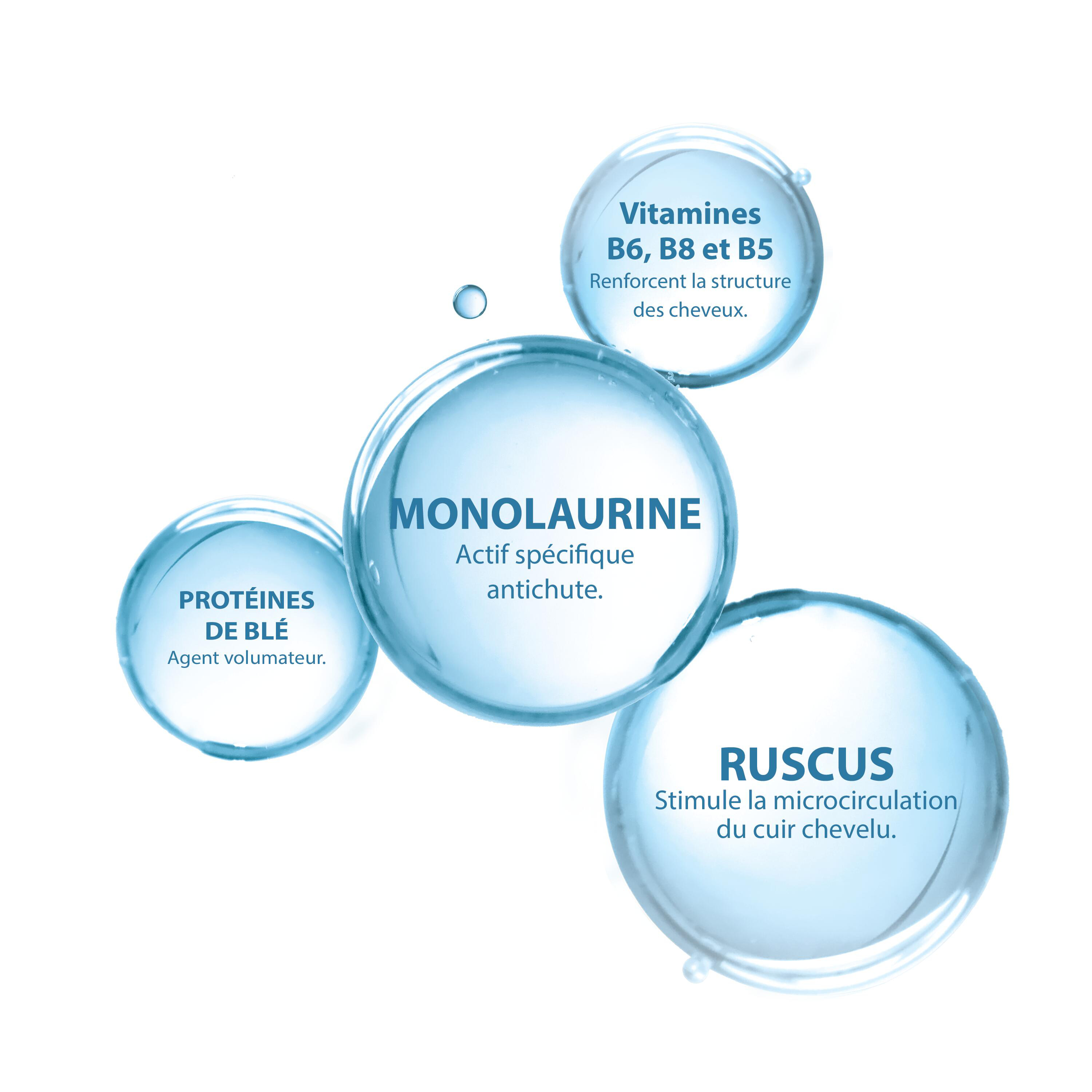 • Appliquer, faire mousser • Rincer • Renouveler l’application en laissant agir 2 à 3 minutes • Appliquer ensuite votre traitement antichute. Rincer en cas de contact avec les yeux.