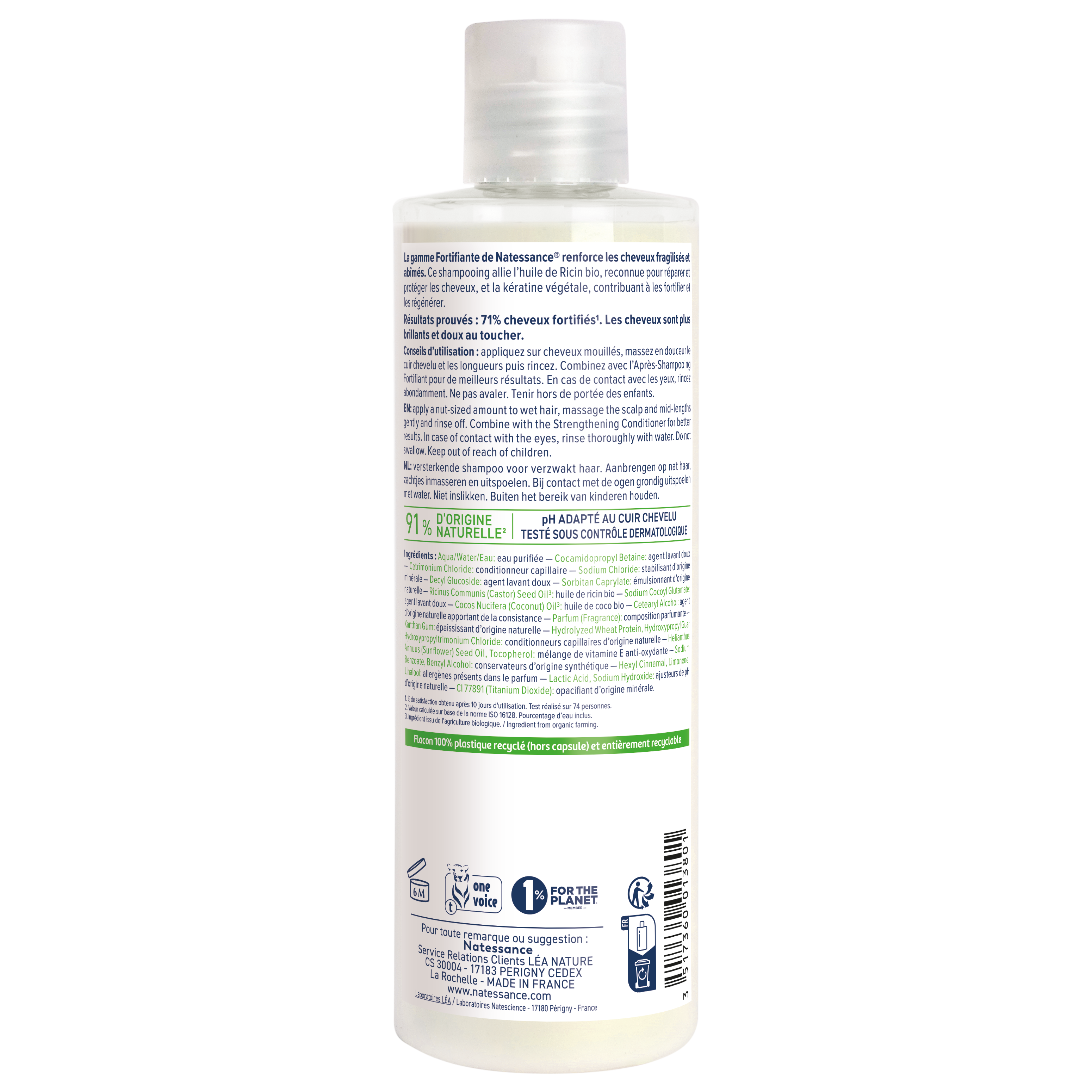 Natessance Shampooing Réparateur Fortifiant Ricin 250 ml texture onctueuse et formule douce, nettoie efficacement les cheveux normaux, secs ou fragilisés. Enrichi en huile de ricin et kératine végétale, il répare le cheveu en profondeur et le fortifie. En effet, l'huile de ricin est utilisée depuis la nuit des temps pour ses propriétés protectrices, réparatrices, sublimatrices. La kératine végétale, quant à elle, est reconnue pour revitaliser et renforcer la sensation d'hydratation du cheveu. La chevelure est souple, légère et pleine de vitalité. 96% du total des ingrédients sont d'origine naturelle. Sans sulfate, paraben, silicone.