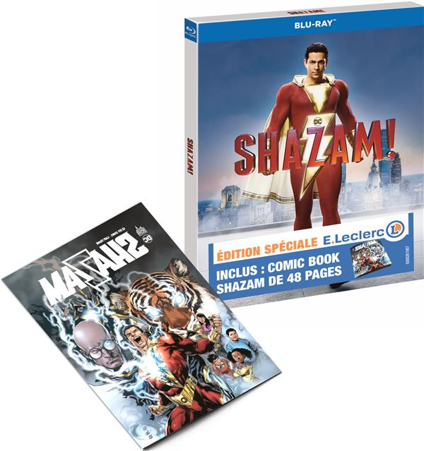 Cette édition spécifique E.Leclerc comprend le comic book : ""SHAZAM"" Volume 1, de 48 pages, écrit par Geoff Johns, ainsi qu'un visuel alternatif exclusif. On a tous un super-héros qui sommeille au fond de soi. il faut juste un peu de magie pour le réveiller. Pour Billy Batson, gamin débrouillard de 14 ans placé dans une famille d'accueil, il suffit de crier ""Shazam !"" pour se transformer en super-héros. Ado dans un corps d'adulte sculpté à la perfection, Shazam s'éclate avec ses tout nouveaux superpouvoirs. Est-il capable de voler ? De voir à travers n'importe quel type de matière ? De faire jaillir la foudre de ses mains ? Et de sauter son examen de sciences sociales ? Shazam repousse les limites de ses facultés avec l'insouciance d'un enfant. Mais il lui faudra maîtriser rapidement ses pouvoirs pour combattre les forces des ténèbres du Dr Thaddeus Sivana.