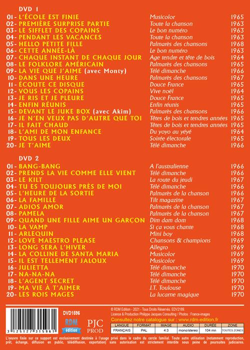 DVD 1 : 1. L'école est finie 2. Première surprise partie 3. Le sifflet des copains 4. Pendant les vacances 5. Hello petite fille 6. Cette année-là 7. Chaque instant de chaque jour 8. Le folklore américain 9. La vie que j'aime (avec Monty) 10. Dans une heure 11. Écoute ce disque 12. Vous les copains 13. Je ris et je pleure 14. Enfin réunis 15. Devant le juke box (avec Akim) 16. Je n'en veux pas d'autre que toi 17. Il fait chaud 18. L'ami de mon enfance 19. Tous les deux 20. Je t'aime DVD 2 : 1. Bang-bang 2. Prends la vie comme elle vient 3. Le kilt 4. Tu es toujours près de moi 5. L'heure de la sortie 6. La famille 7. Adios amor 8. Pamela 9. Quand une fille aime un garçon 10. La vamp 11. Arlequin 12. Love maestro please 13. Long sera l'hiver 14. La colline de Santa Maria 15. Il est tellement jaloux 16. Julietta 17. Na-na-na 18. L'agent secret 19. Ma vie à t'aimer 20. Les Rois mages.