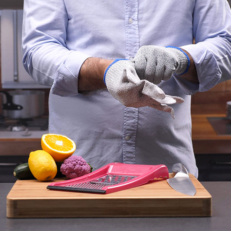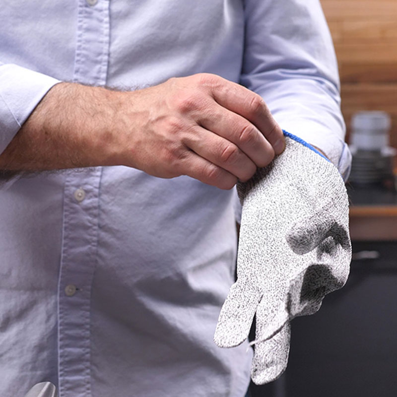 Découpez vos ingrédients sans craindre de vous entailler les doigts grâce aux gants anti-coupure Safe Gloves. Leur matière ultra résistante vous protègera de vos ustensiles tranchants. Ces gants sont parfaits pour les tâches en cuisine mais aussi pour le jardinage ou le bricolage. Nous nous sommes déjà tous retrouvés dans cette situation : un couteau qui dérape, le coup de mandoline de trop, et c'est la coupure assurée. Cuisiner peut être dangereux pour vos doigts. Les Safe Gloves vont remédier à ce problème. C'est fini, vous ne vous prendrez plus une phalange dans la râpe à fromage. Ces gants intelligents, sont résistants aux coupures dues aux ciseaux, couteaux et râpes. Ces problèmes appartiennent désormais au passé. Les matériaux uniques des Safe Gloves ne confèrent pas seulement une protection fiable à vos mains, ces gants sont également très agréables à porter grâce à leur texture flexible. Ils collent à la peau pour ne pas vous gêner dans vos mouvements. Avec Safe Gloves, plus de risque de se couper les doigts en cuisinant grâce à ces gants ultra résistants. Leur matière est très résistante aux lames de couteaux, râpes à fromage et autres mandolines, mais aussi à d'autres instruments coupants, tels que les cutters, sécateurs, etc. Ils sont parfaits pour les tâches de cuisine mais aussi pour le jardinage ou le bricolage. Même vos plantes piquantes n'arriveront pas à vous transpercer la peau. Caractéristiques : 1 paire de gants anti-coupures Classe de protection 4 Certificat : CE/CAT II 344 XD/EN388 Matière :45% polyéthylène à poids moléculaire très élevé (UHMW-PE), 20% polyester, 13% polyamide, 12% élasthanne, 10% fibre de verre Dimensions : 24 x 13 x 0.2 cm Poids : 95 gr Lavage en machine (40°C)