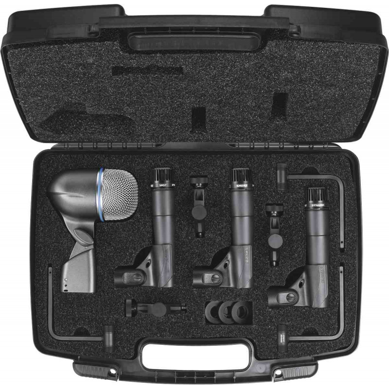 Kit 4 micros batterie comprenant: : \n - 1 micro grosse caisse Beta 52A \n - 3 micros instruments SM57 \n - 3 fixations pour fûts A56D \n - 1 mallette de transport