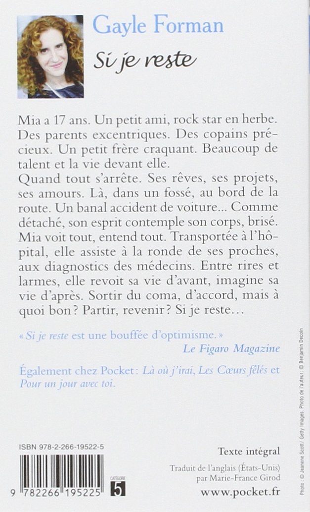 Quand, un jour, tout s'arrête. Ses rêves, ses projets, ses amours. Là, dans un fossé, au bord de la route. Un banal accident de voiture... Comme détaché, son esprit contemple son propre corps, brisé. Mia voit tout, entend tout. Transportée à l'hôpital, elle assiste à la ronde de ses proches, aux diagnostics des médecins. Entre rires et larmes, elle revoit sa vie d'avant, imagine sa vie d'après. Sortir du coma, d'accord, mais à quoi bon ? Partir, revenir ? Si je reste...