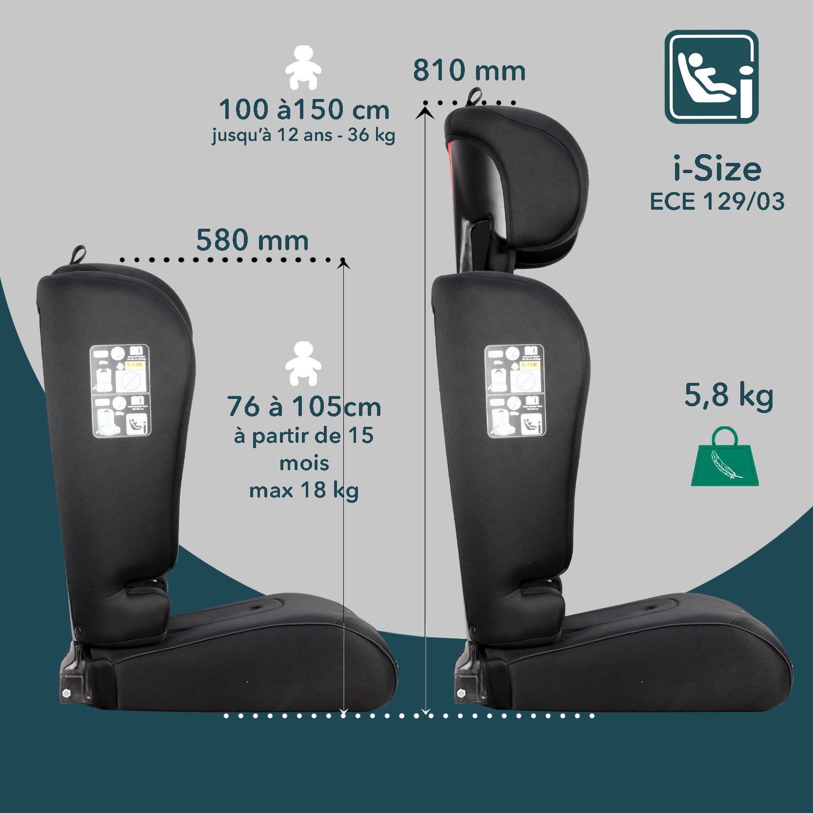 Siège auto de 76 à 150 cm / i-Size ECE R23+ de 9 à 36 kg de 15 mois à 12 ans Harnais 5 avec protecteurs, et réglage centralisé Appui tête réglable en hauteur