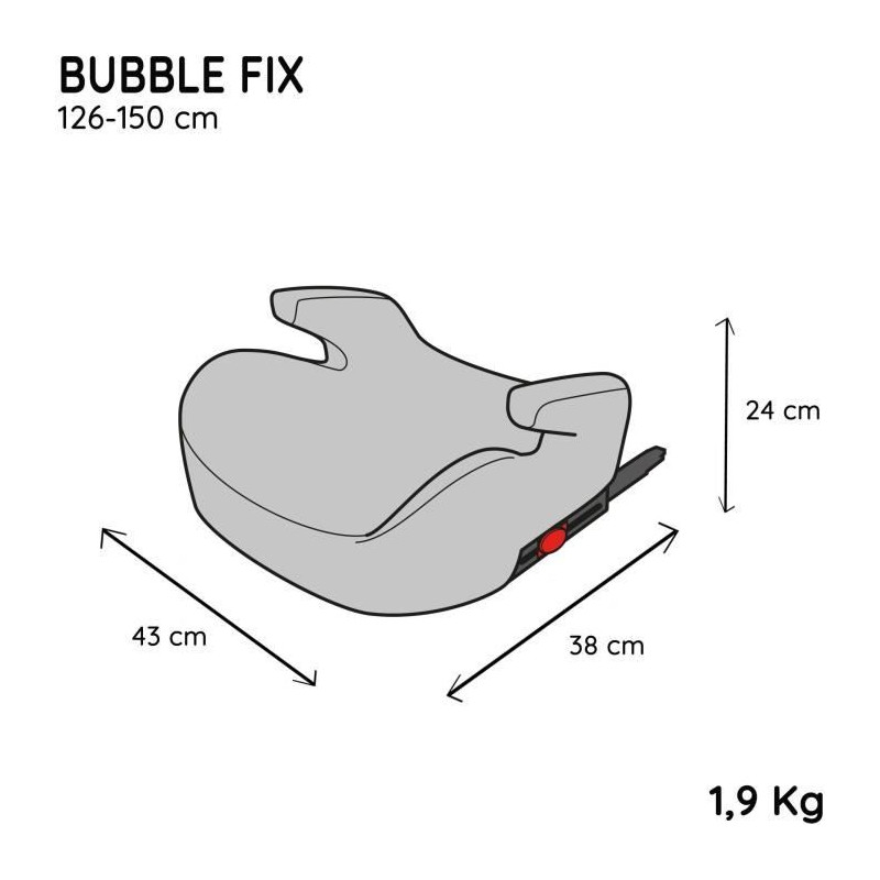 Rehausseur bas BUBBLE FIX R129 i-Size pour les enfants de 126 a 150 cm soit d'environ 8 ans a 12 ans, il est fabriqué et testé en France et homologué selon la norme UN R129. Le rehausseur est équipé de fixations isofix ce qui permet une installation rapide et sécuritaire, de plus le siege auto est toujours attaché meme lorsque l'enfant n'est pas dans le siege ce qui évite que le rehausseur devienne un projectile dangereux en cas d'accident. L'enfant s'installe avec la ceinture de sécurité 3 points et le rehausseur s'installe uniquement face a la route a l'arriere du véhicule. Le rehausseur est équipé d'accoudoirs pour plus de confort, de plus l'assise est haute. La housse est déhoussable et lavable a la main.