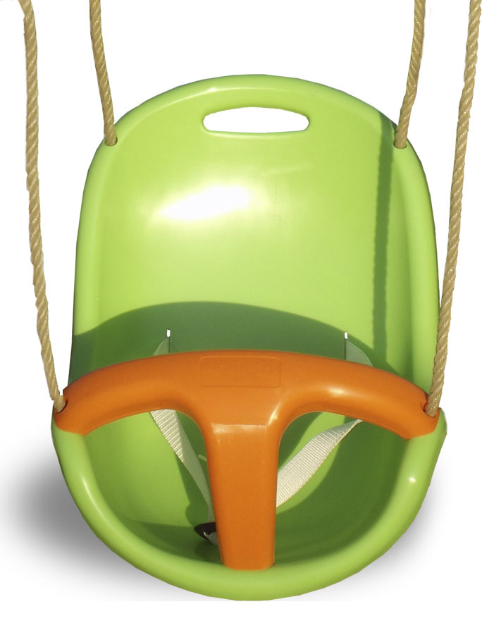 Siège bébé pour portique 1.90 / 2.50 m coloris vert et orange. Ceinture de sécurité ventrale avec entrejambes pour enfant de 9 à 36 mois jusqu'à 20kg