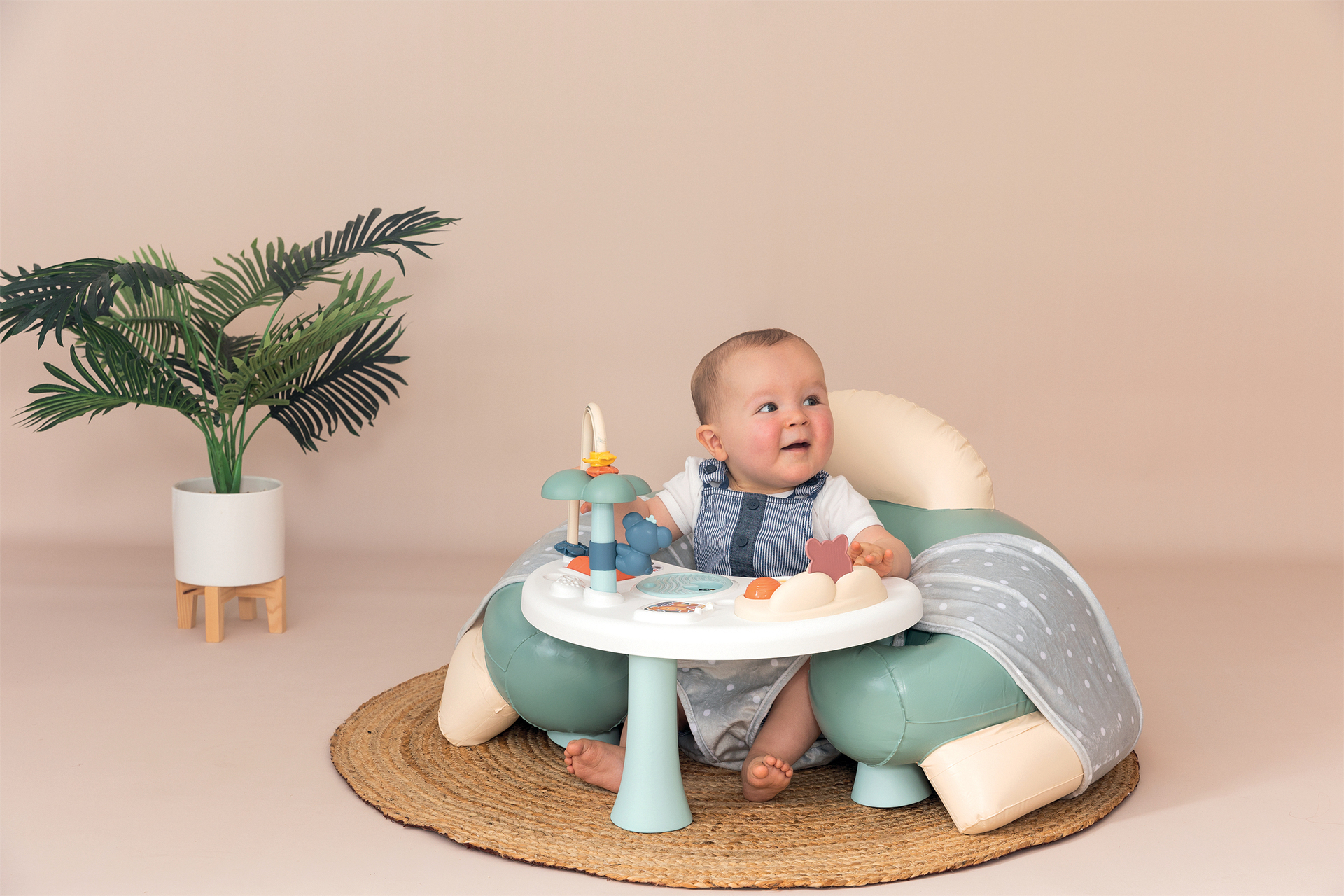 Plus produit Siège bébé avec accoudoirs recouverts d\'une housse tissu. Tablette avec de nombreuses activités déveil : miroir, pinet sonore... Siège et tablette peuvent sutiliser séparément.
