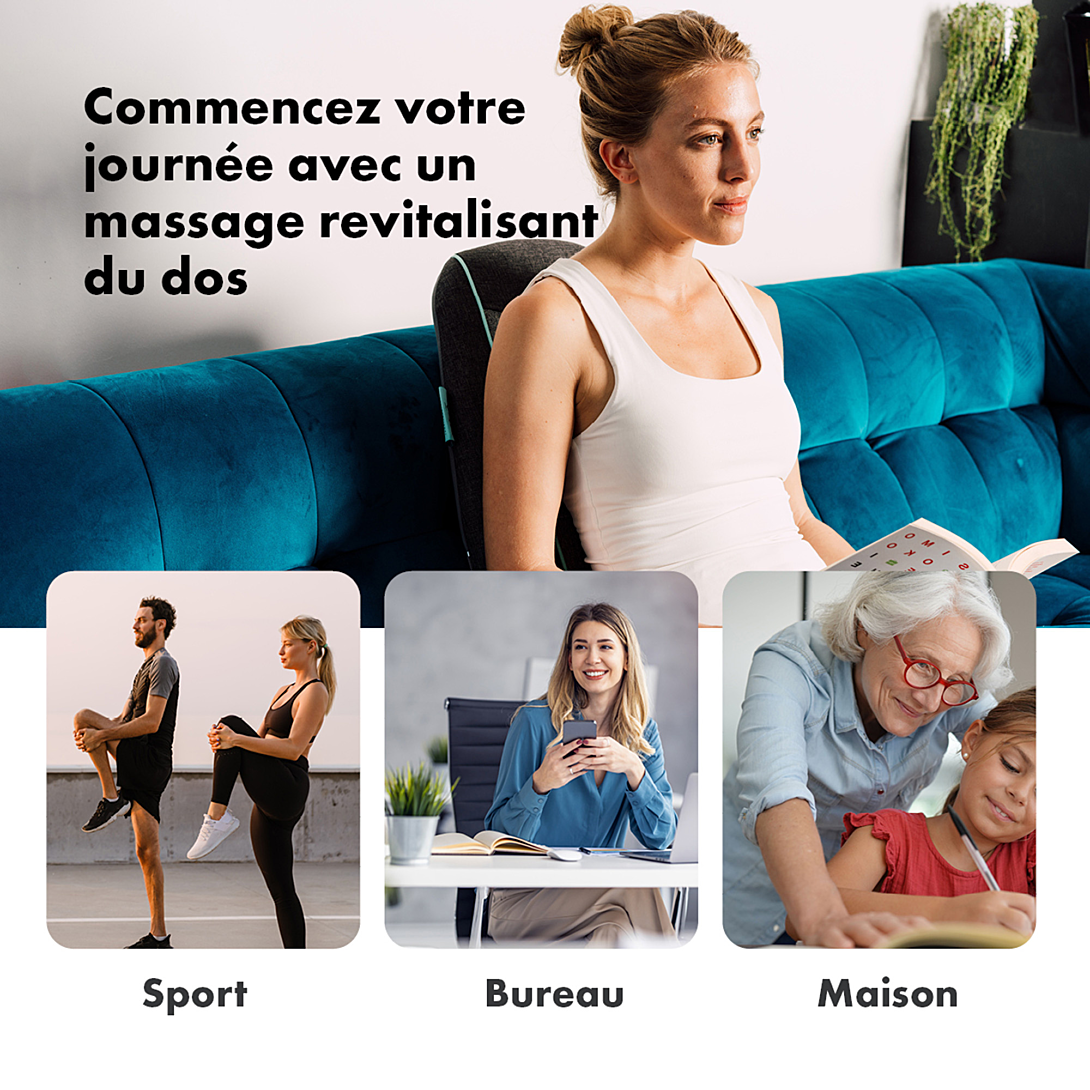 | Plus produit | Étiquette aromatique intégrée; tissu denim Oeko‑Tex; assise plate amovible; massage shiatsu 3 zones avec chaleur |