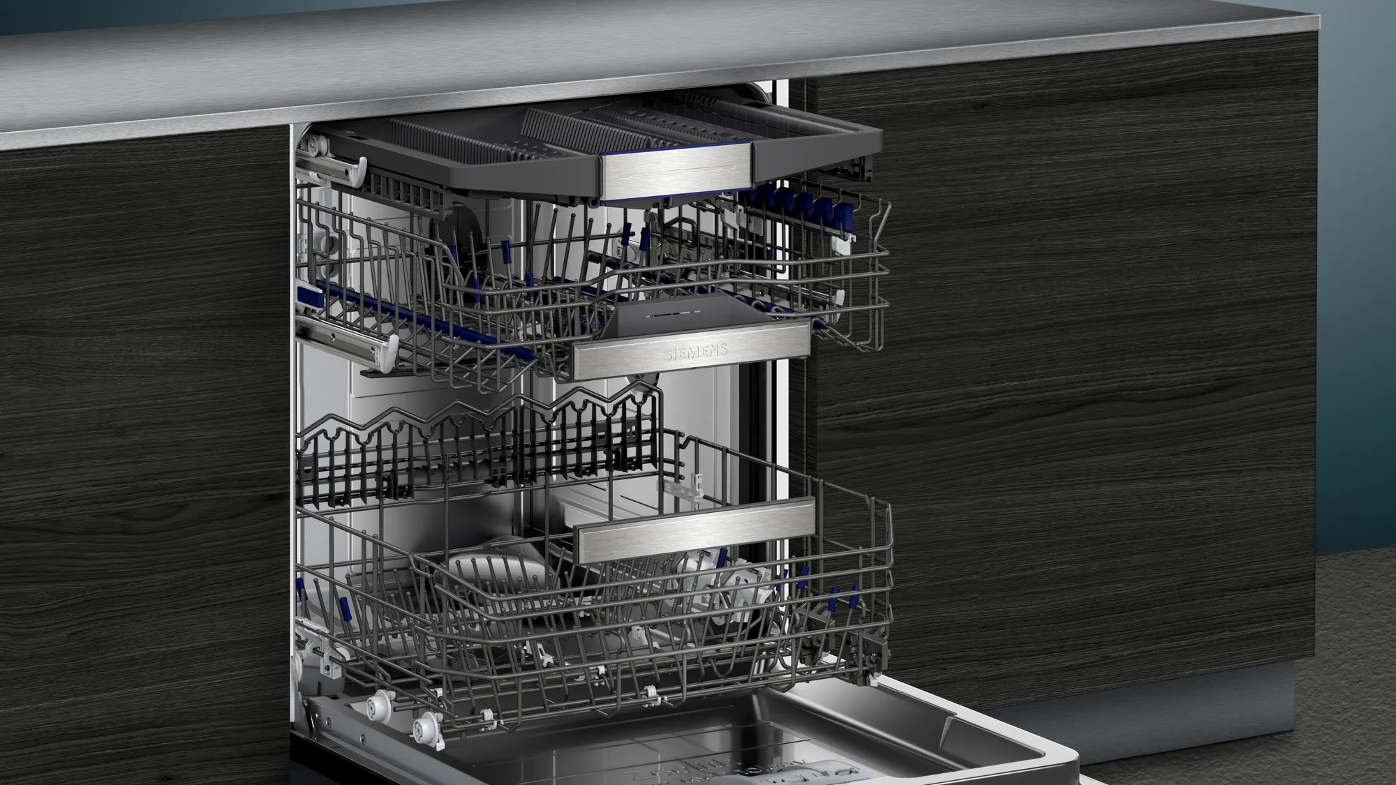 Les lave-vaisselle premium Siemens ont un design extérieur et intérieur remarquable. Ils possèdent des touchPoints bleus permettant de visualiser facilement les points de flexibilité des panier. Les possibilitées de chargement sont donc illimitées.