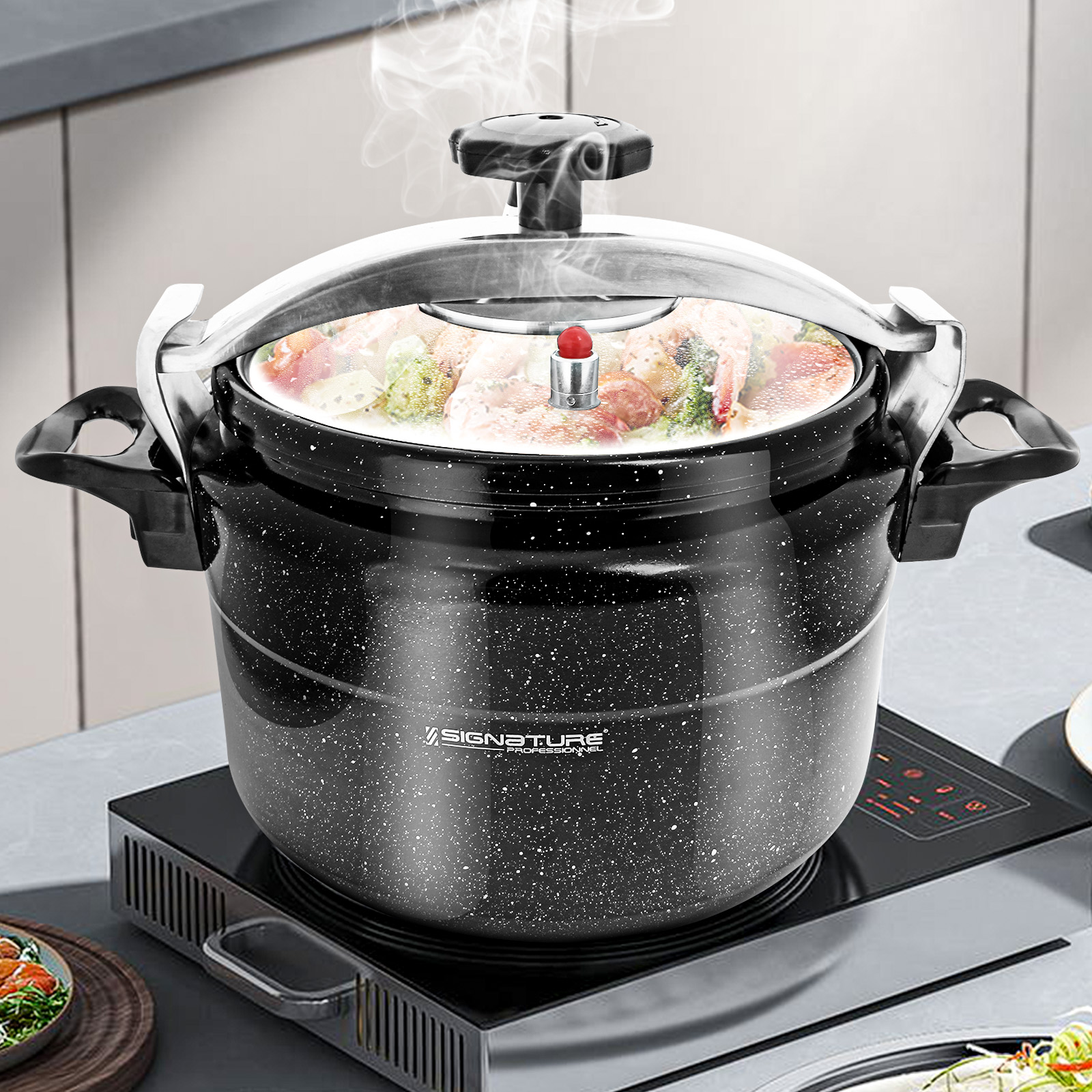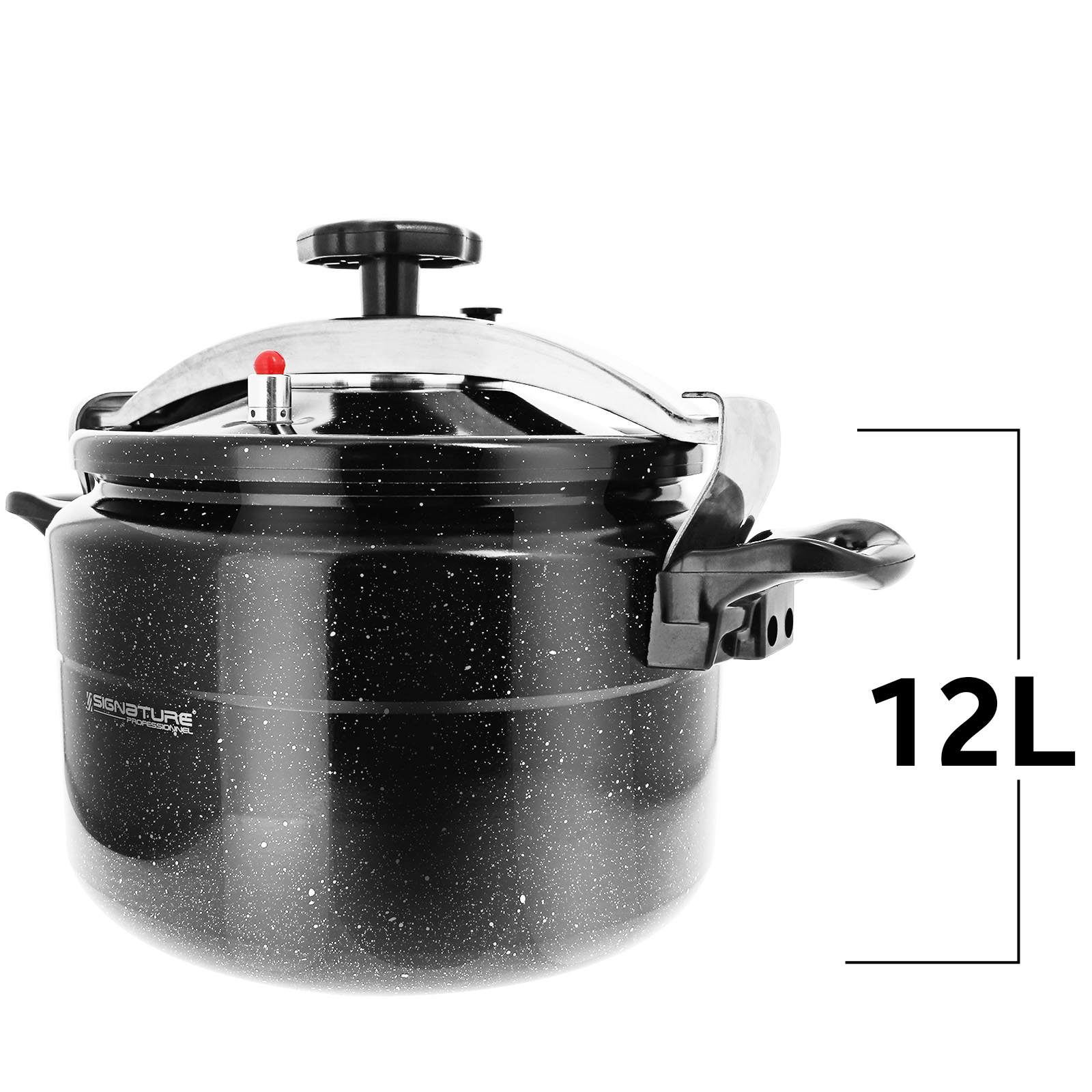 Autocuiseur Signature Professionnel d'une capacité de 12 litres, conçu en aluminium avec revêtement anti-adhérent effet marbre pour une cuisson saine et homogène. Compatible tous feux dont induction, il est équipé d'un couvercle sécurisé avec soupape de sécurité et poignées ergonomiques. Sa conception en trois couches assure robustesse et durabilité. Facile à nettoyer et compatible lave-vaisselle, il est idéal pour une utilisation quotidienne.