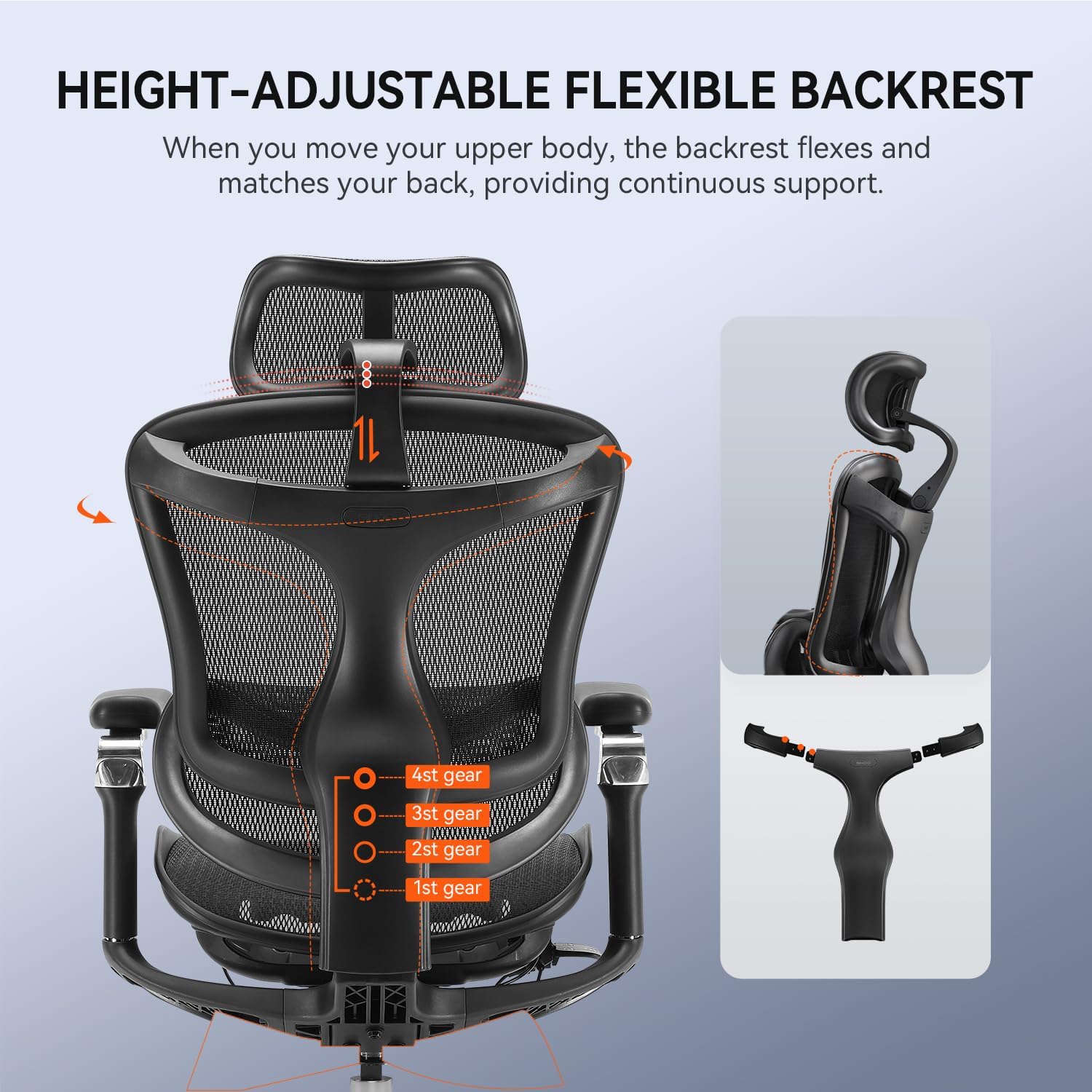 Son dossier en mesh respirant et structure triangulaire flexible épouse les mouvements du haut du corps. Avec 4 réglages de hauteur (déplacement vertical de 6 cm), il s'adapte à toutes tailles. En position maximale, il revient automatiquement au niveau le plus bas.